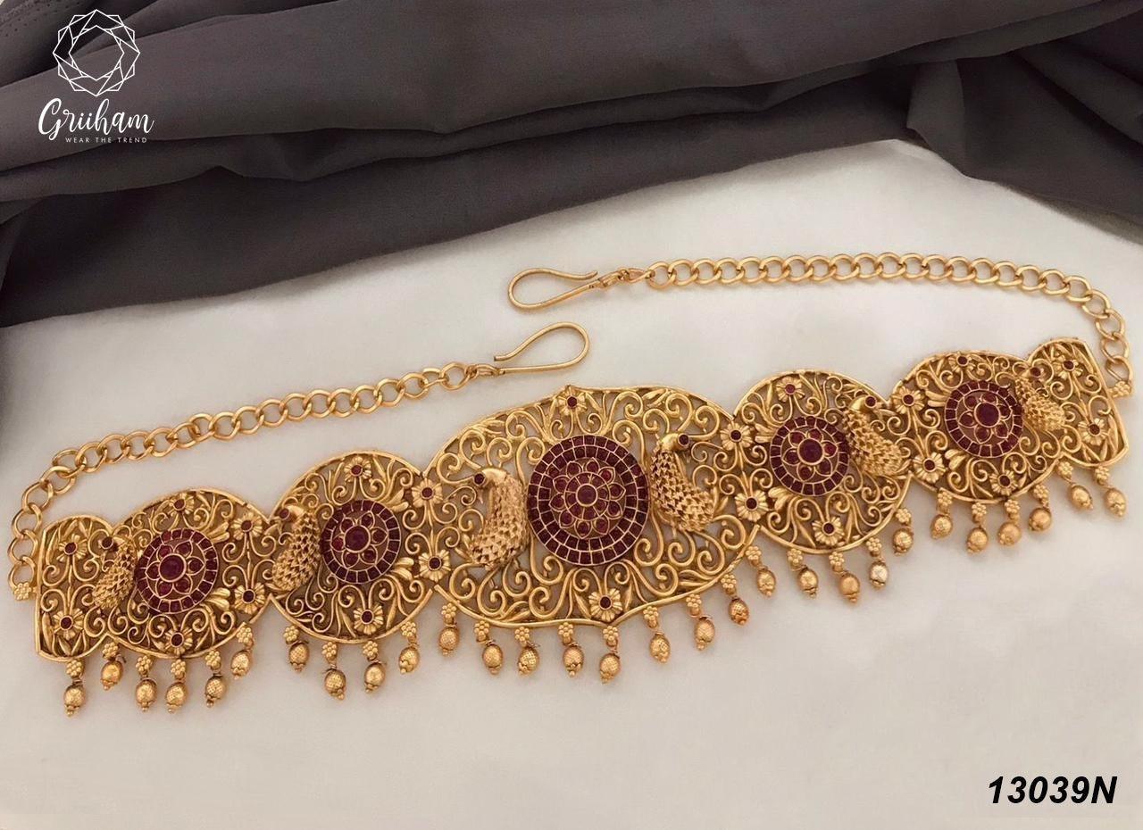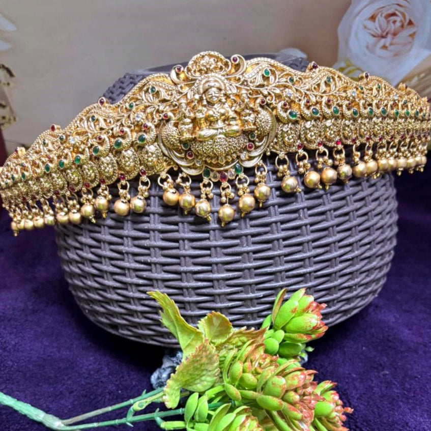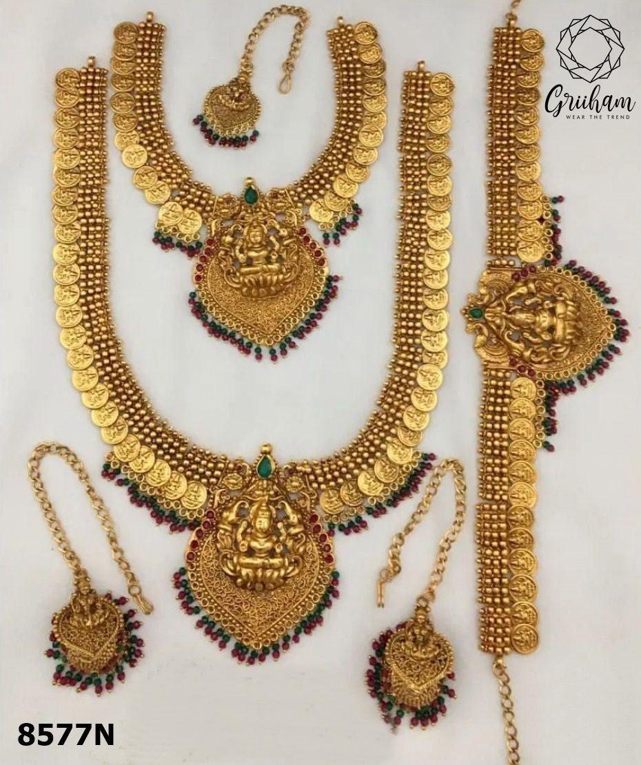 Green Crystal bunch design/Maroon Crystal /Pearls  with temple pendant long necklace set