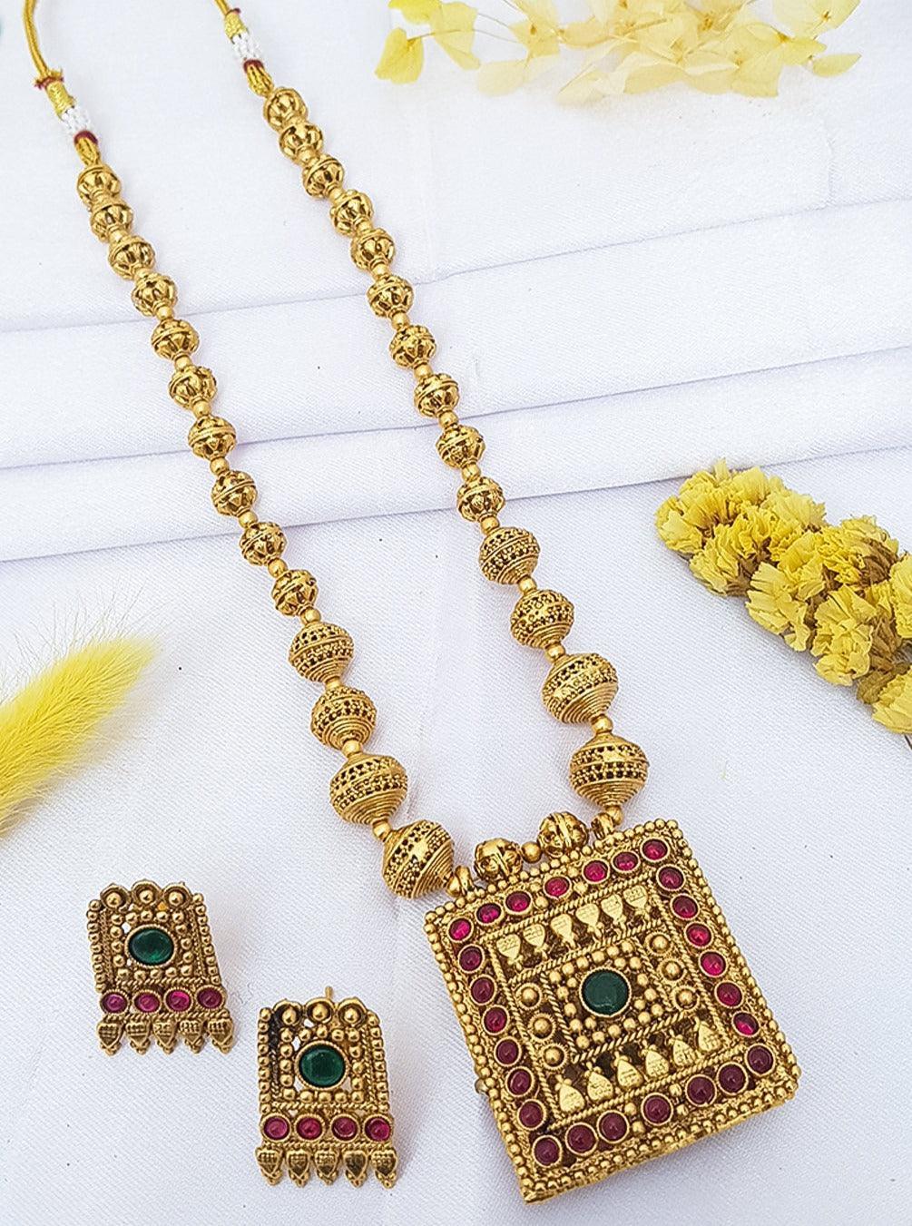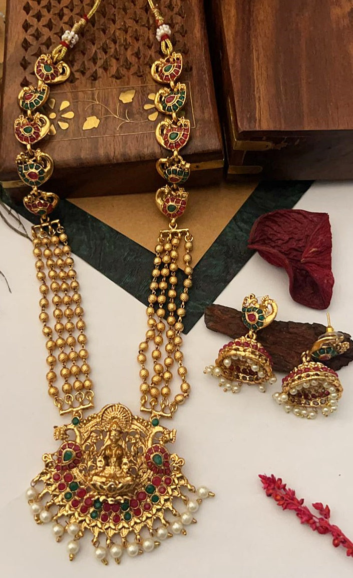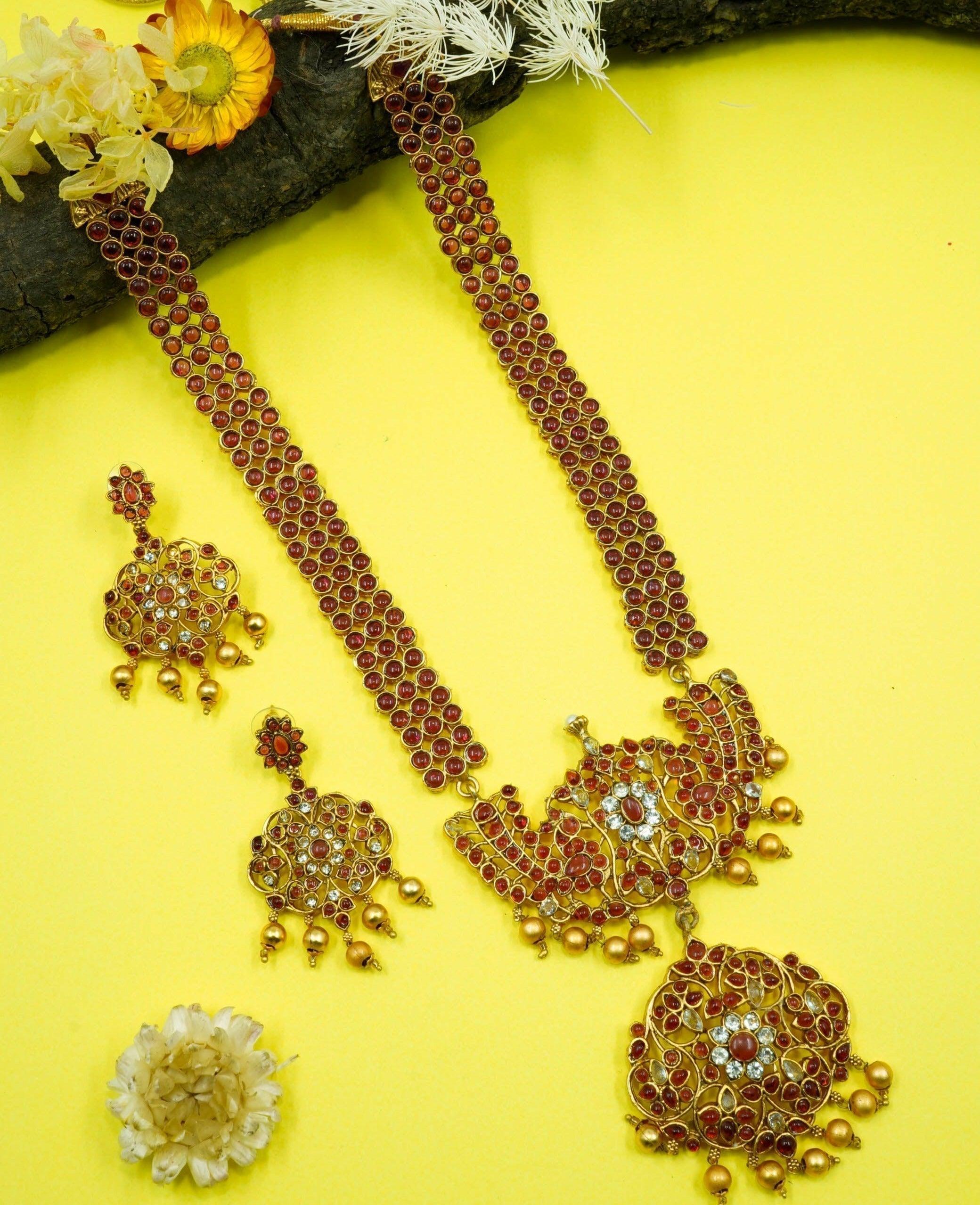 Premium Copper base antique gold plated Gold look alike temple jewelry with ruby Long necklace set