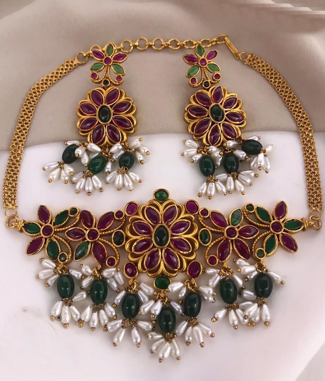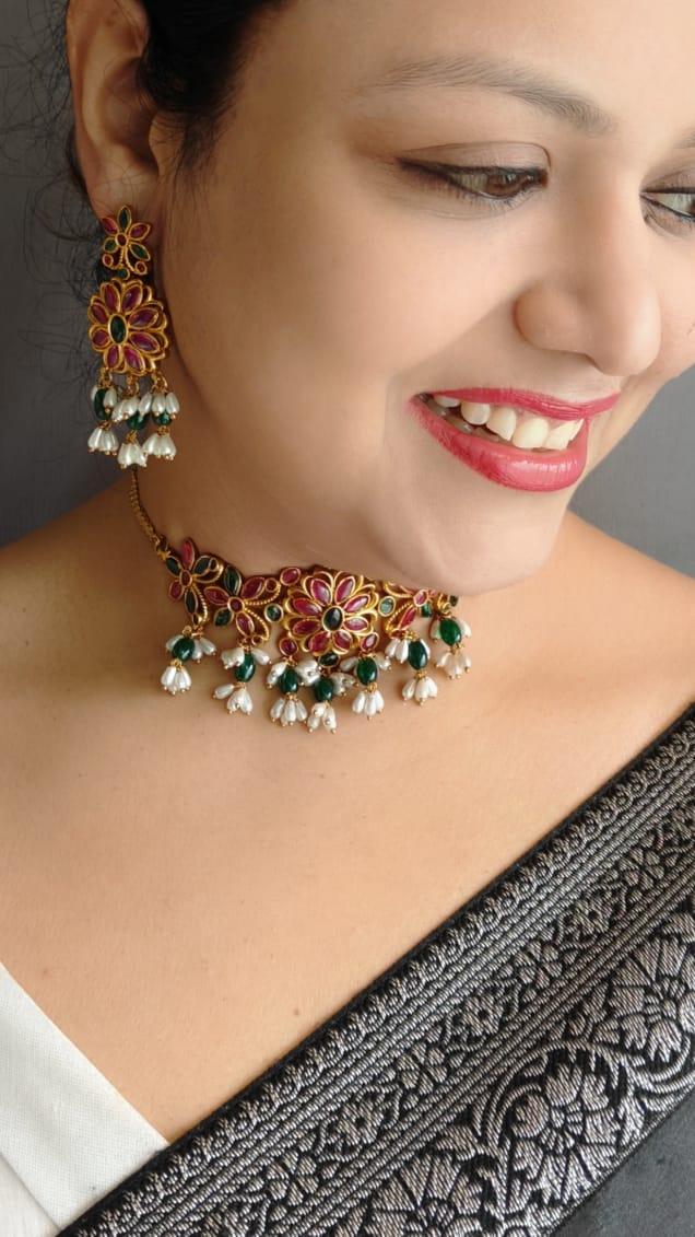 Chain with Lotus Floral motif Short Necklace Set original meenakari