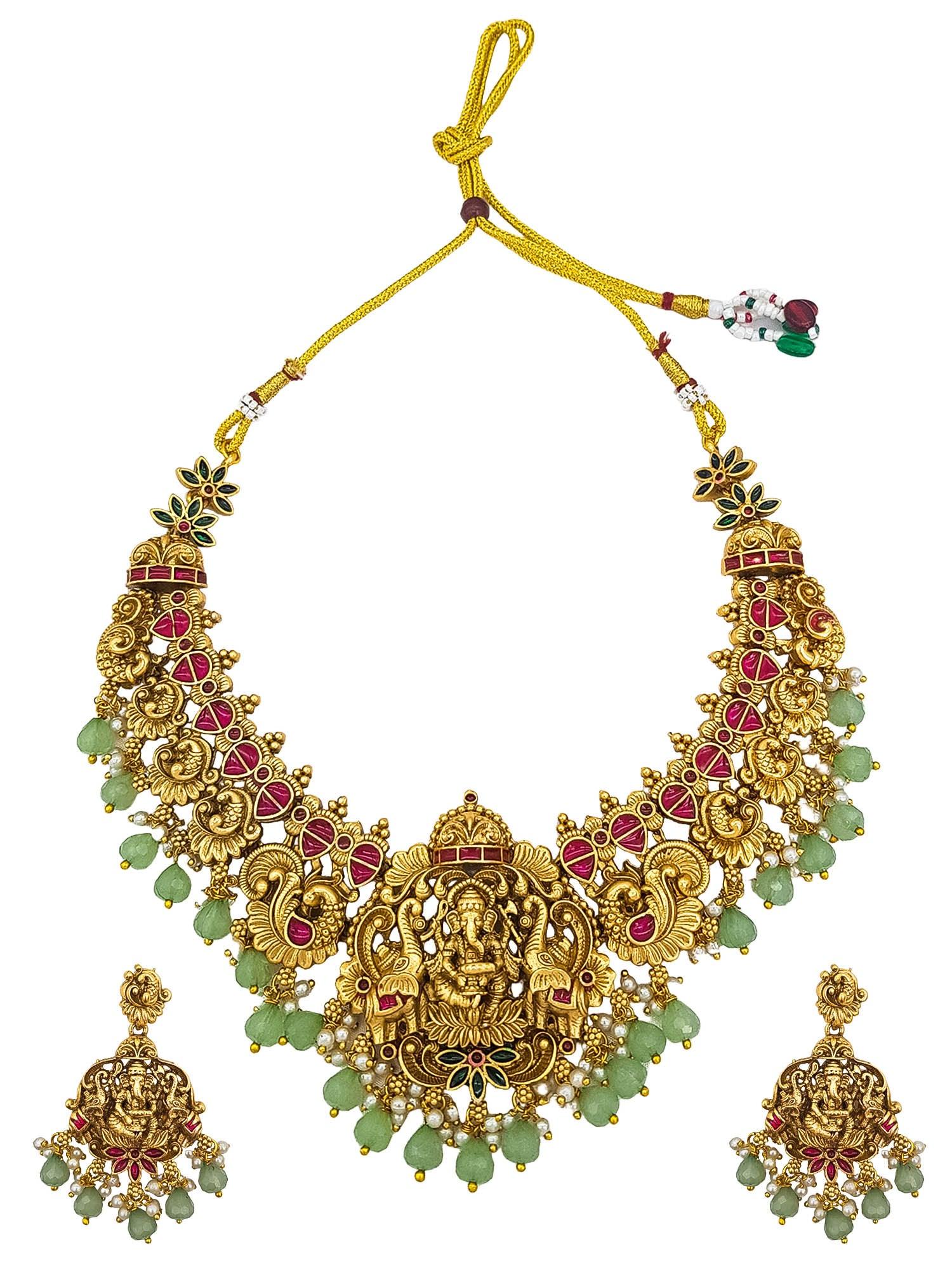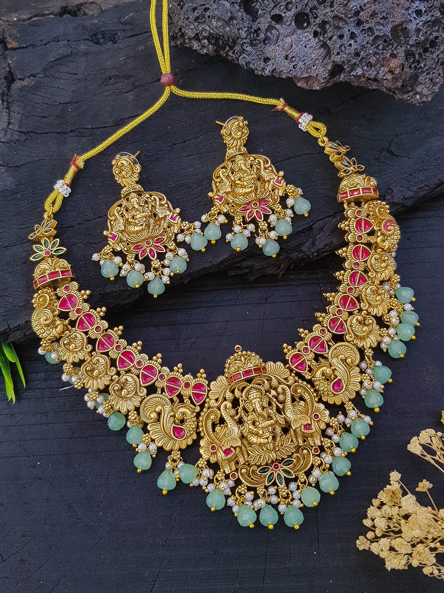 Gold Plated premium Necklace Set with Mint Green Crystal Maala