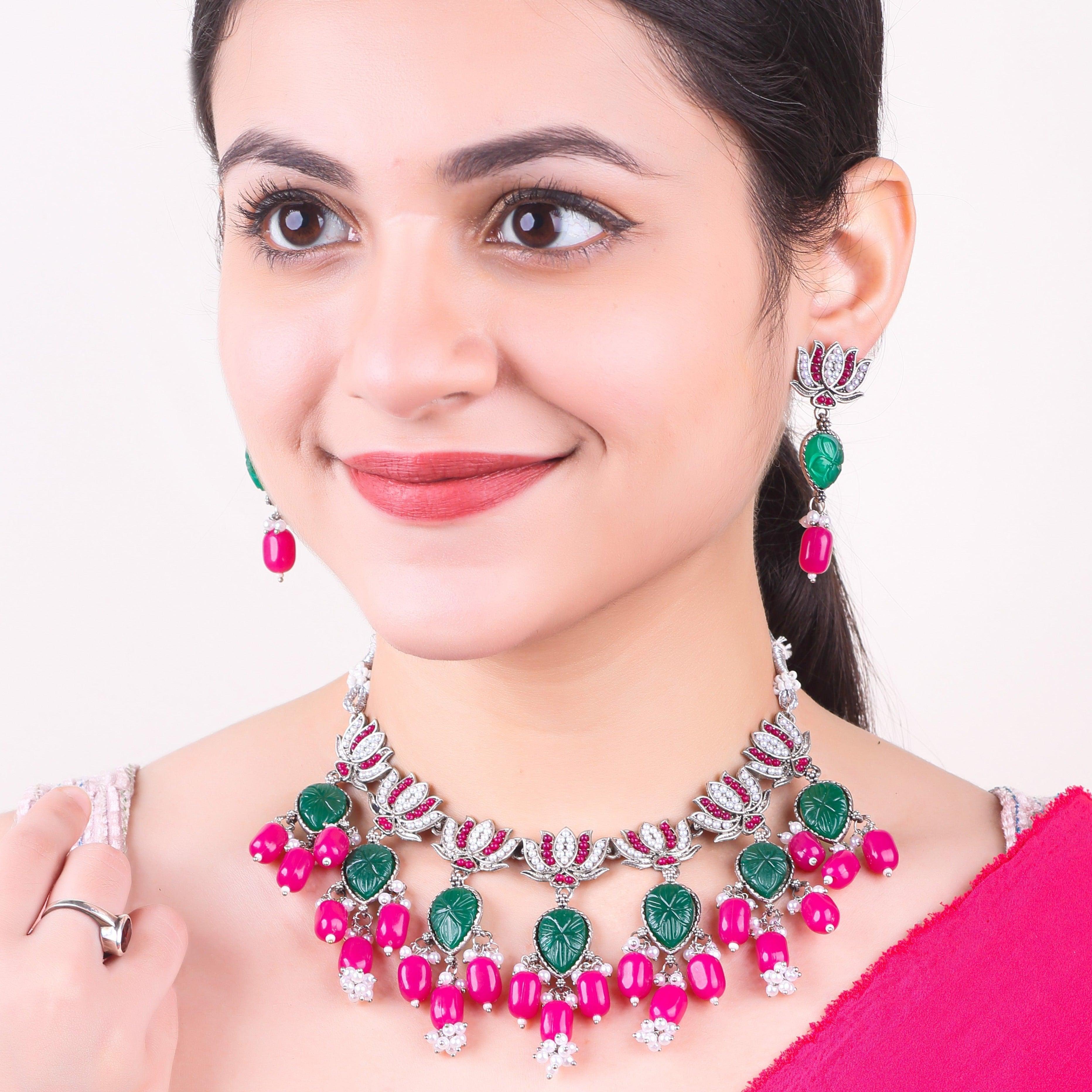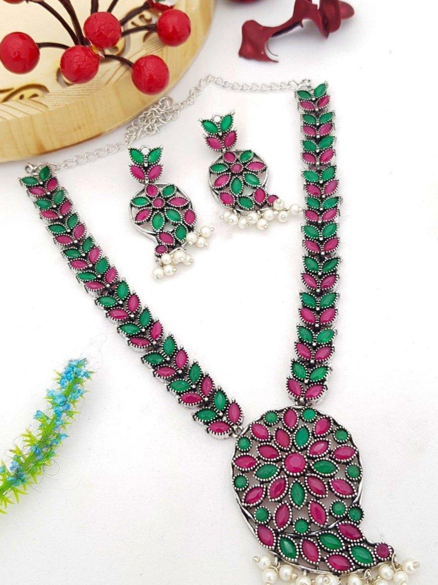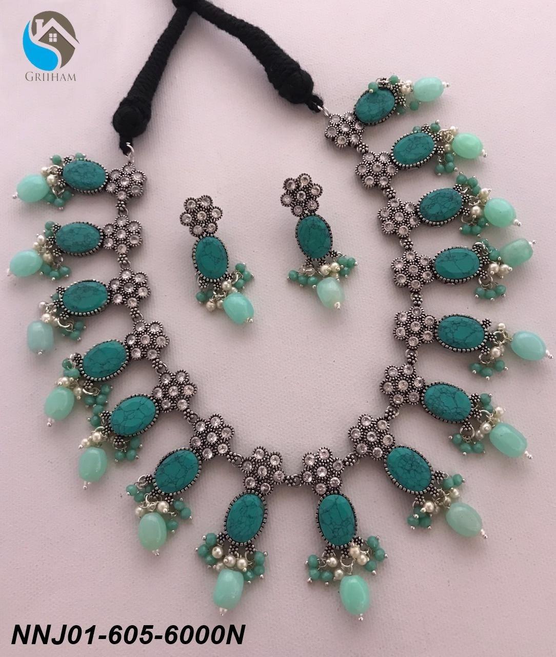 German Silver Plated oxidised multicolor stone Necklace set - Griiham