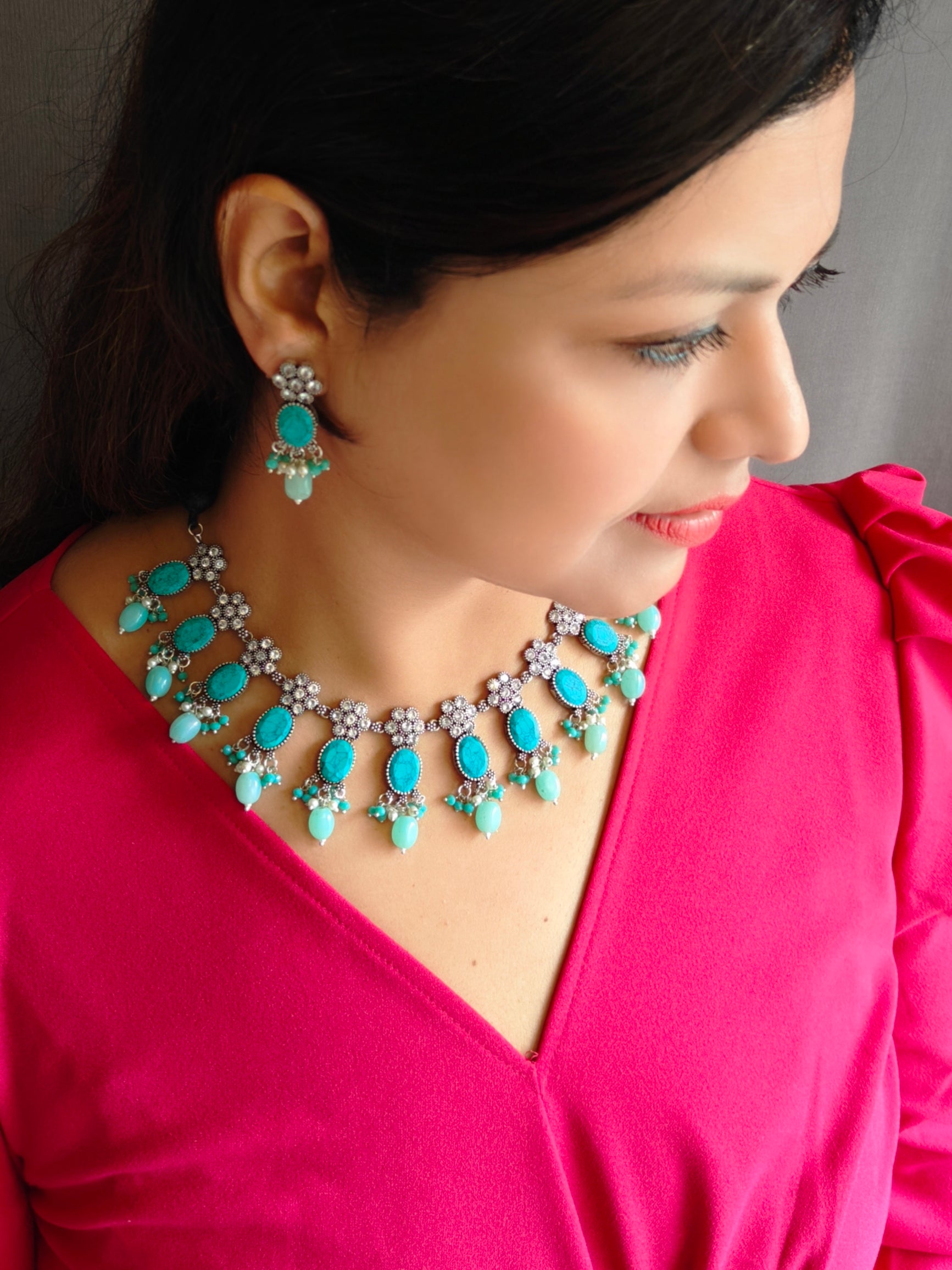 Silver Oxidised short Necklace set with Blue colour stones for all occasion