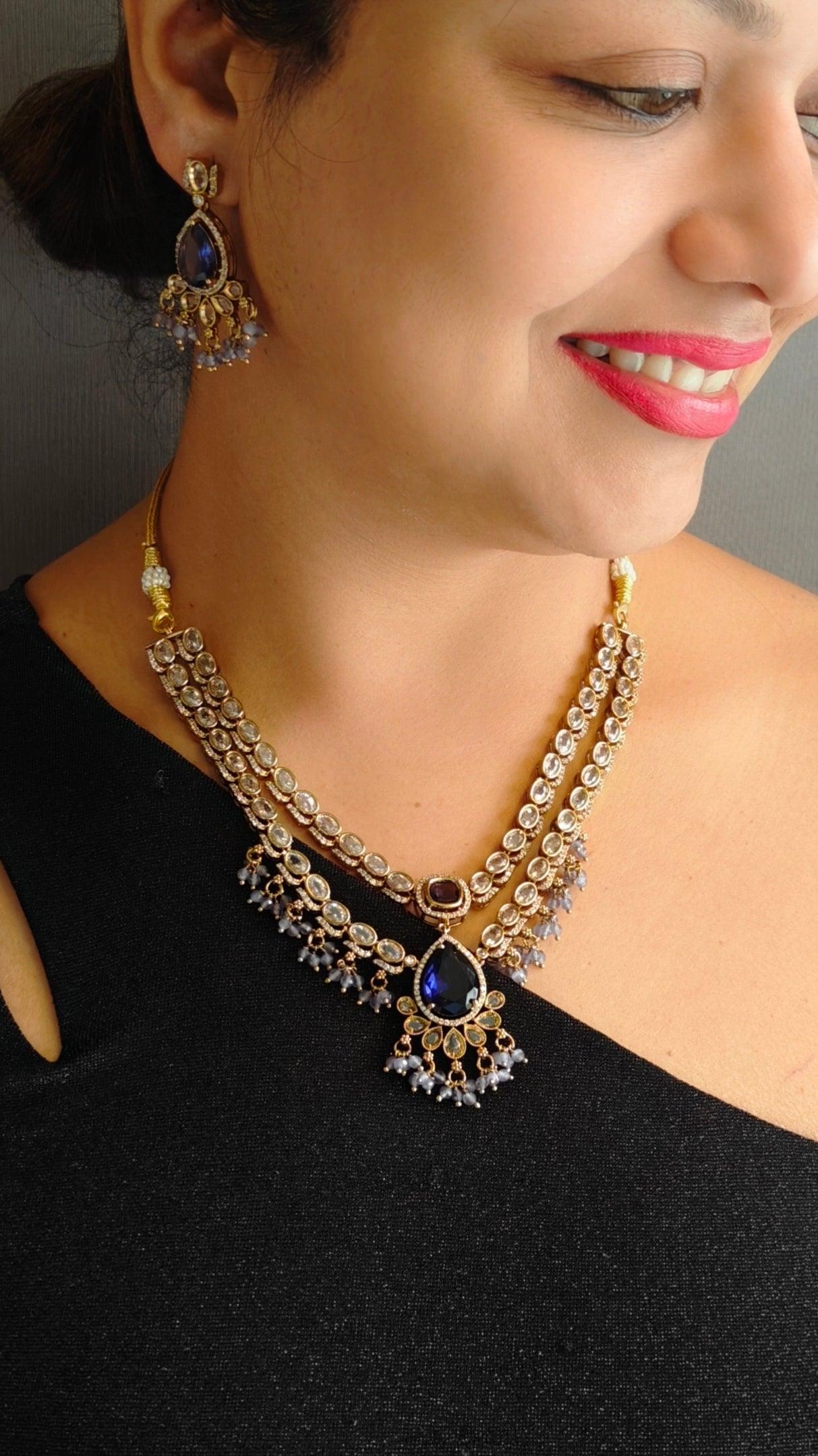 Silver Oxidised short Necklace set with Blue colour stones for all occasion - Griiham