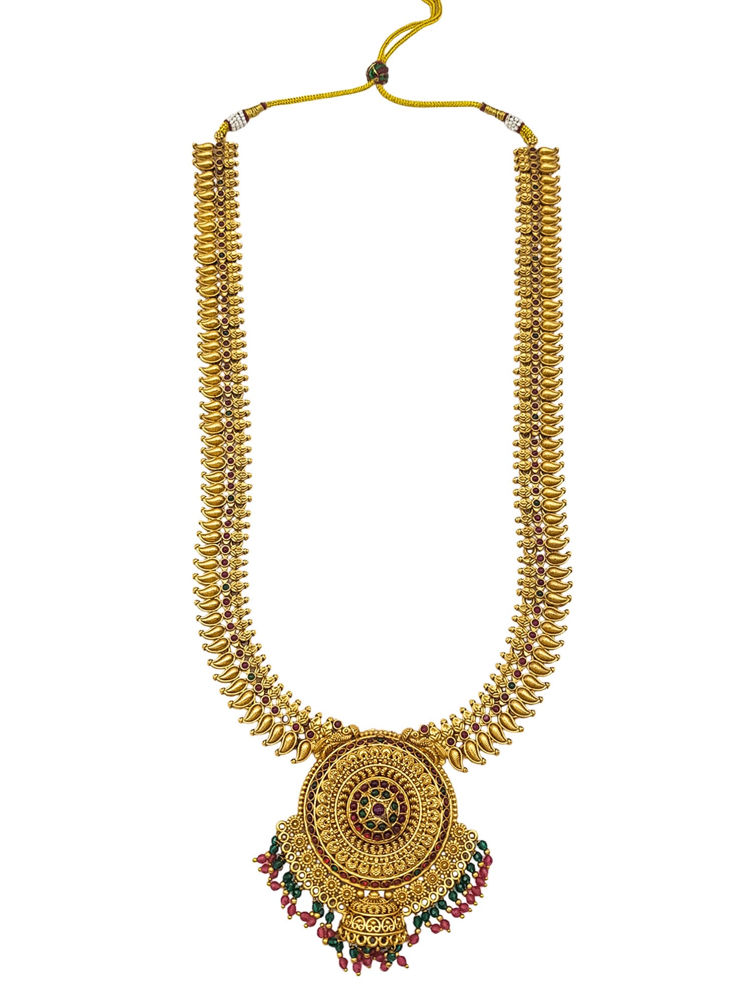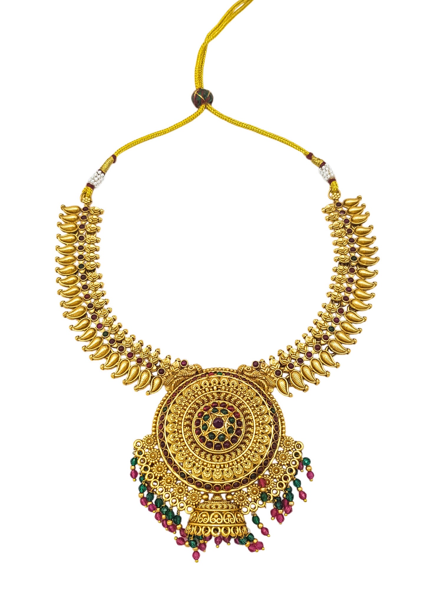 Add a touch of antique elegance to your bridal look with our Premium Gold finish Laxmi necklace combo set. Featuring a traditional Laxmi necklace, this combo set is the perfect addition to any bride's ensemble. Bring good luck and prosperity with this stunning piece.