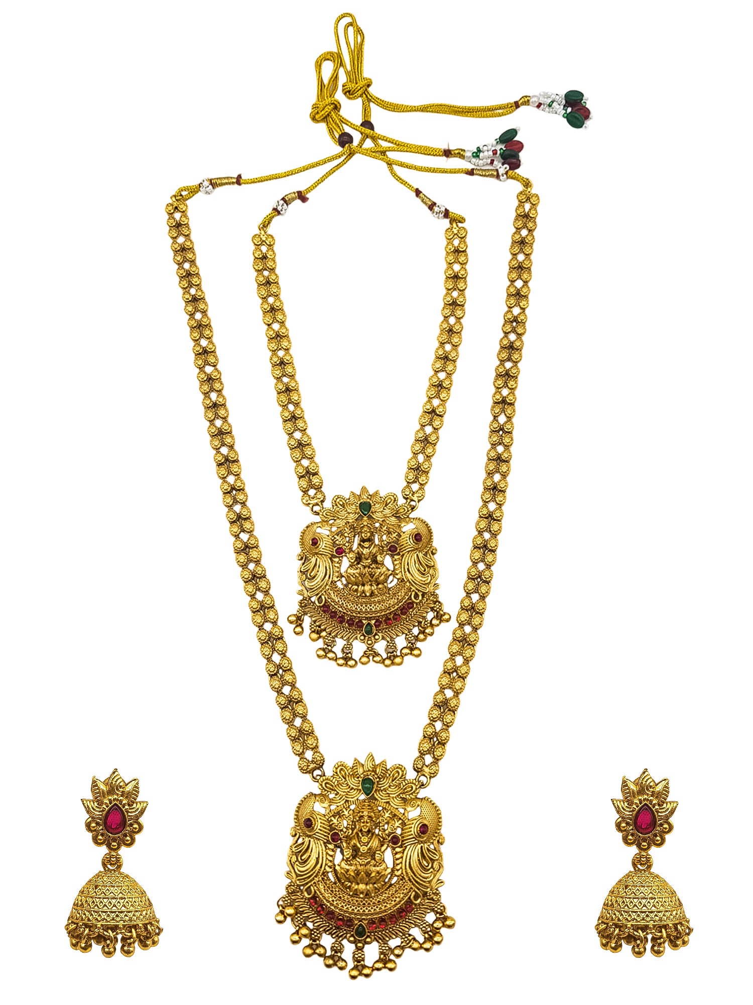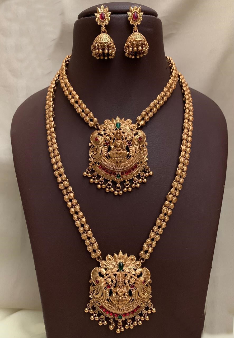 Add a touch of antique elegance to your bridal look with our Premium Gold finish Laxmi necklace combo set. Featuring a traditional Laxmi necklace, this combo set is the perfect addition to any bride's ensemble. Bring good luck and prosperity with this stunning piece.