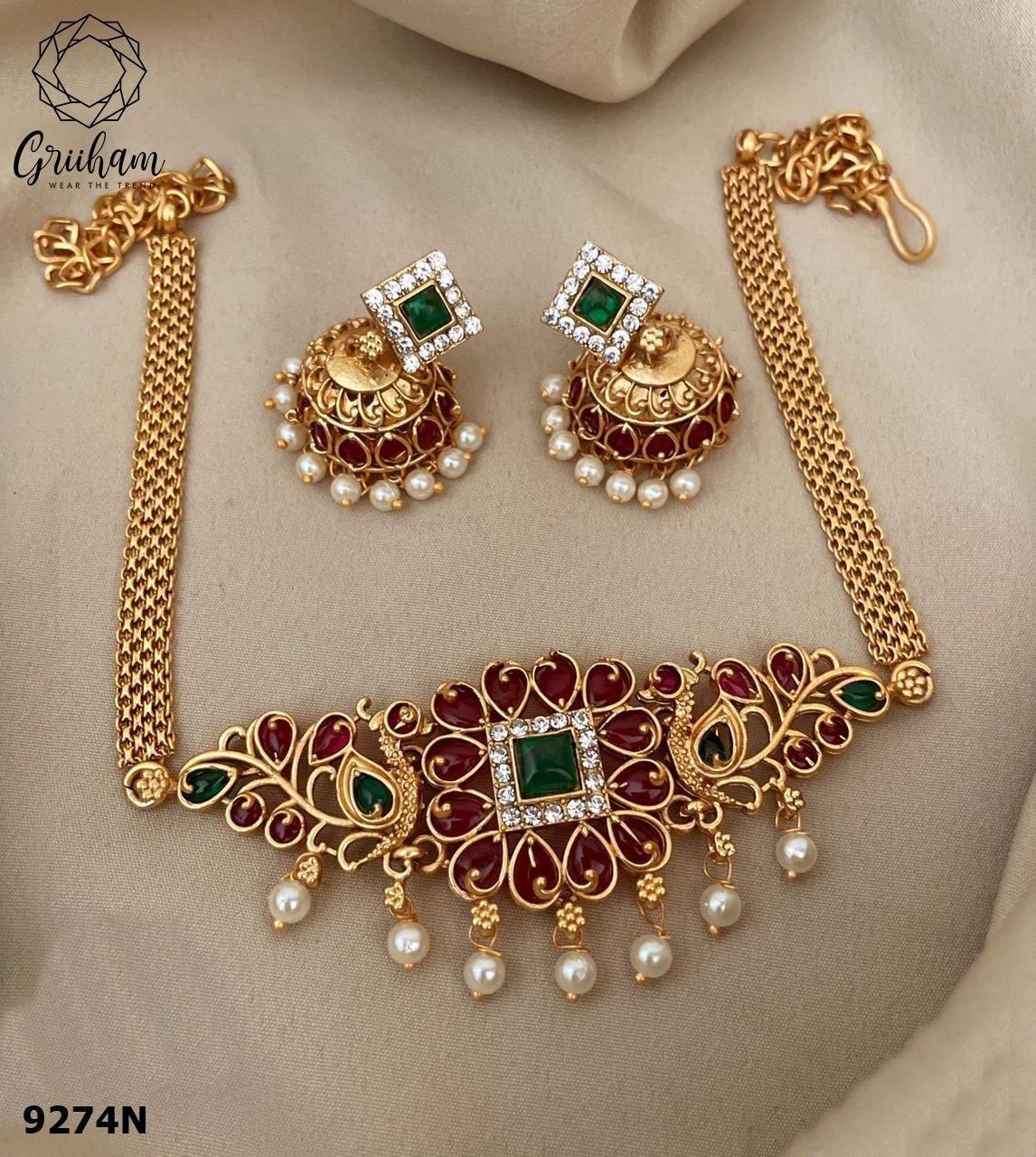This designer choker features a beautiful peacock design crafted from multicolor stones. Enjoy the timeless elegance of this choker and make it a must-have for your jewellery collection.