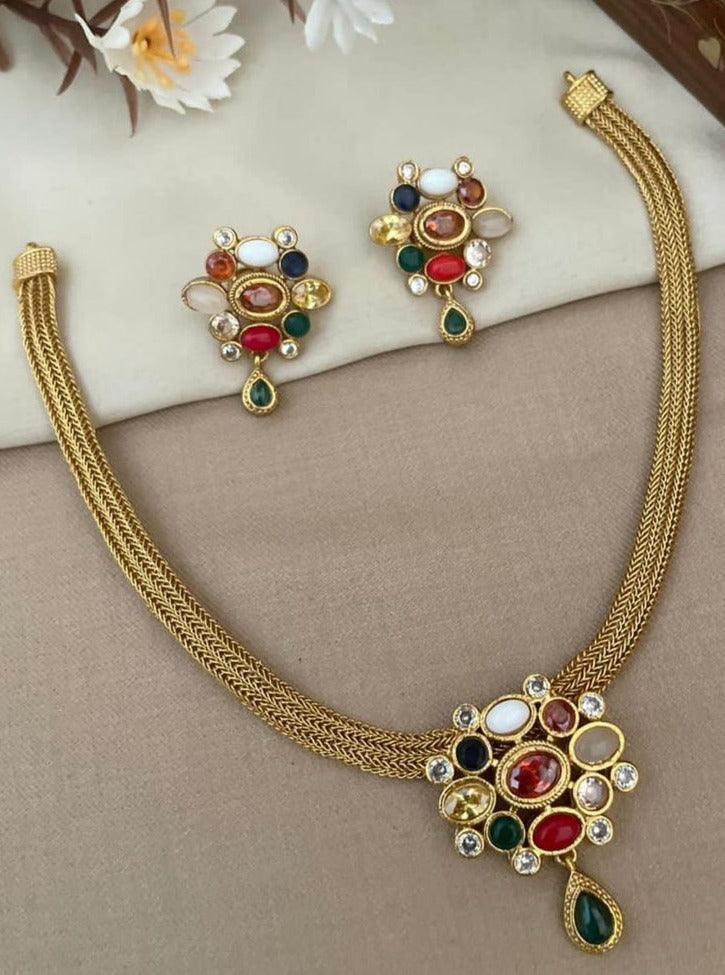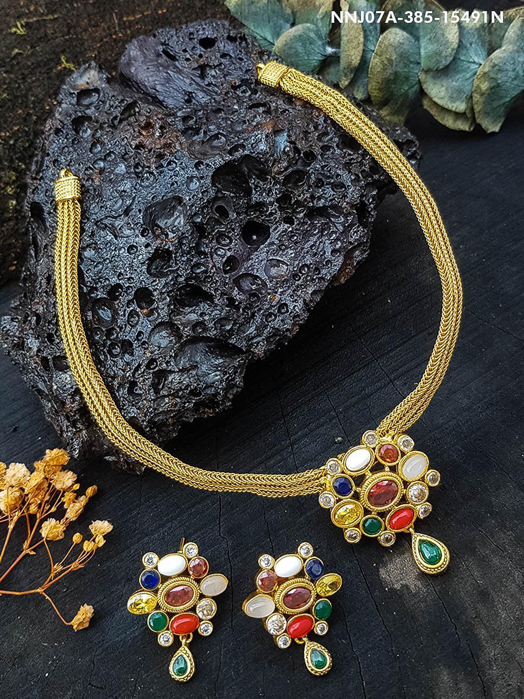 Unlock your inner explorer with this elegant gold plated Navratna neckace set. With bold, high-quality stones, you can flash your adventurous side with style and sophistication. Unleash your spirit and show the world who you really are!