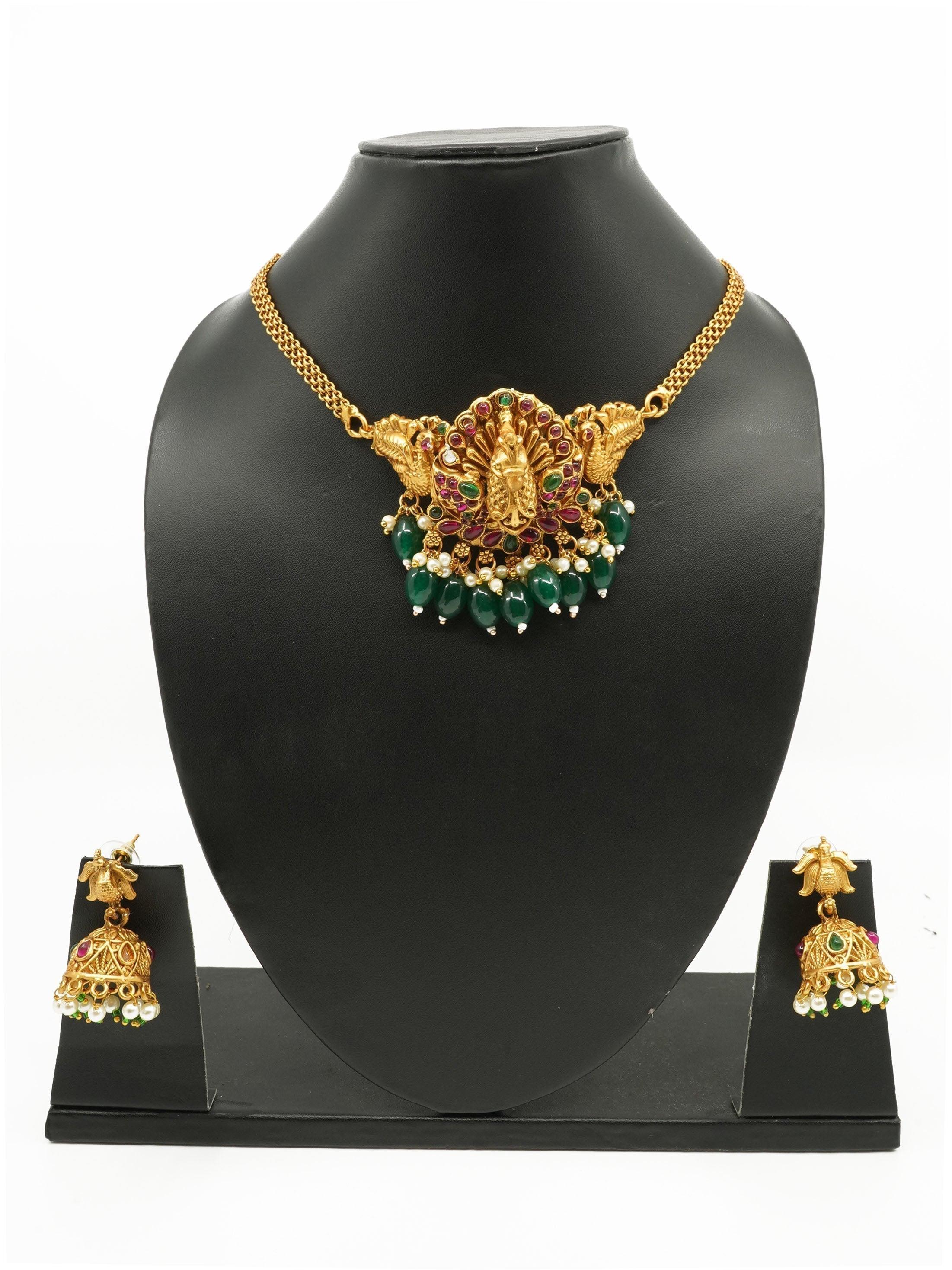 • This Premium peacock Gold Finish Choker Necklace Set features an eye-catching peacock pendant design, crafted with superior quality materials and finished with a luxurious gold coating. A must-have item for any fashionista, perfect for a special occasion or a night out.