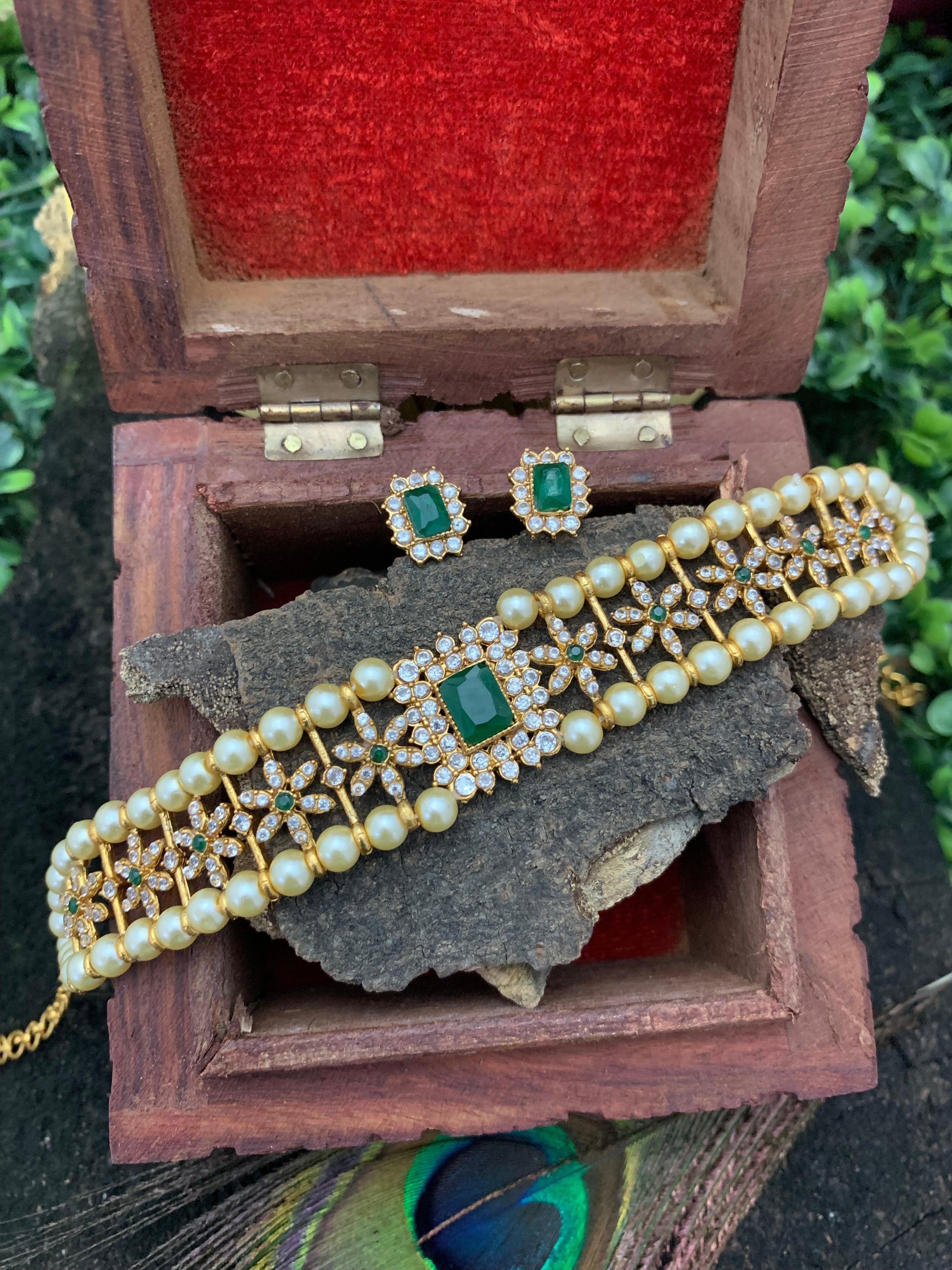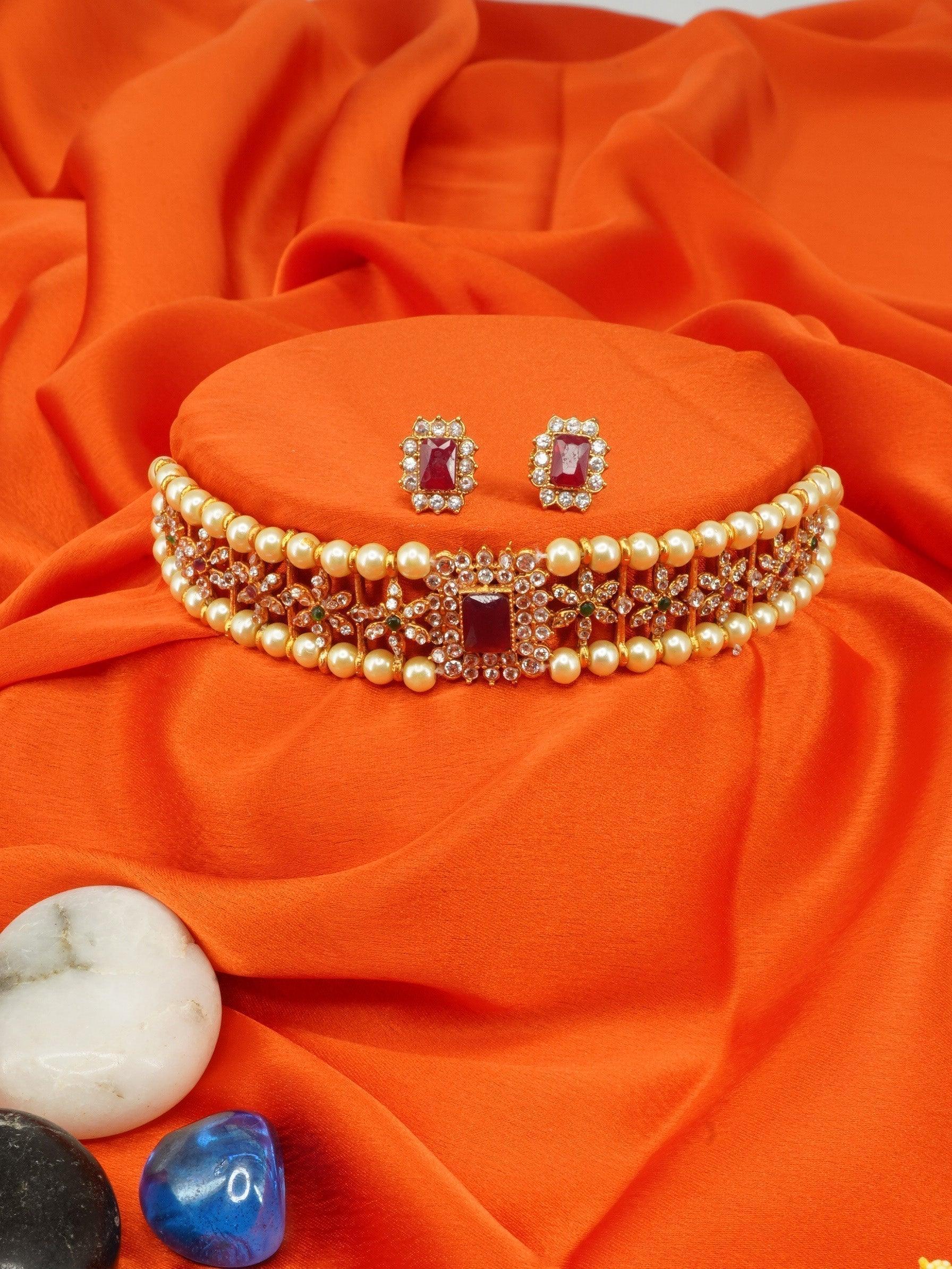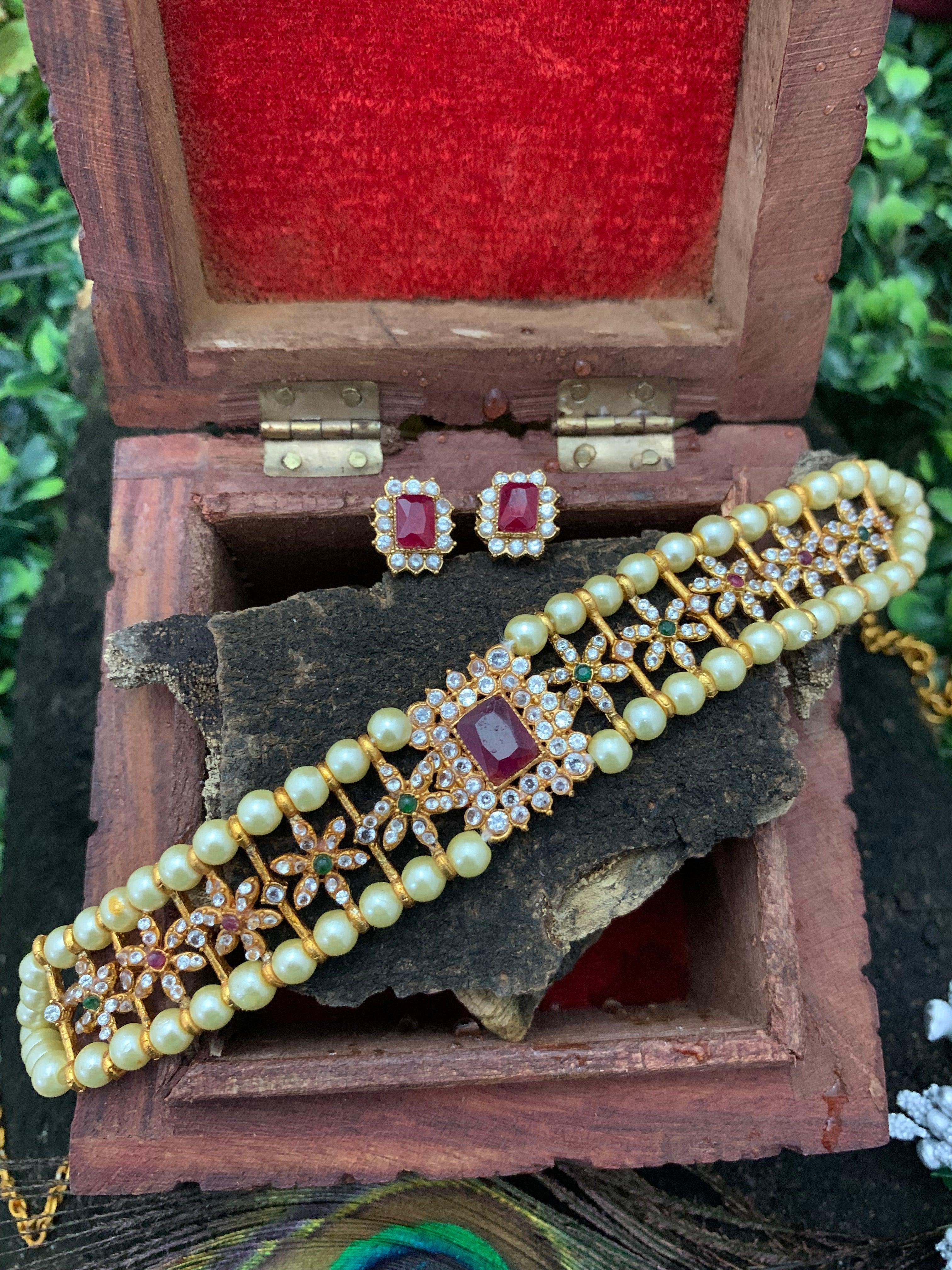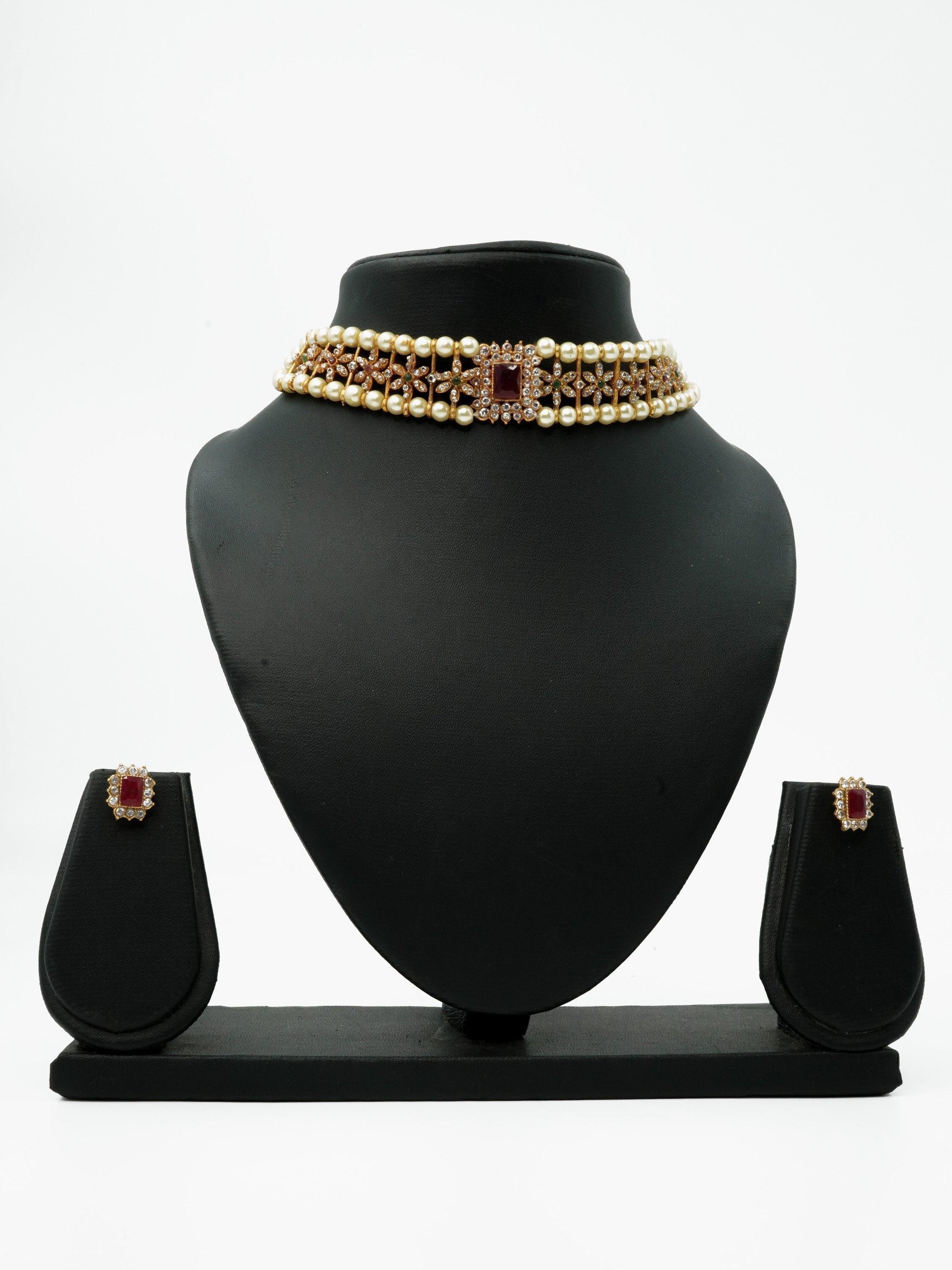 Treat yourself to the Sayara Collection choker pearl necklace set: a luxe combination of CZ choker for an exquisite look, and a classic pearl necklace to add an elegant touch! And don't forget the stud earrings - get your 'bling' on with this set!