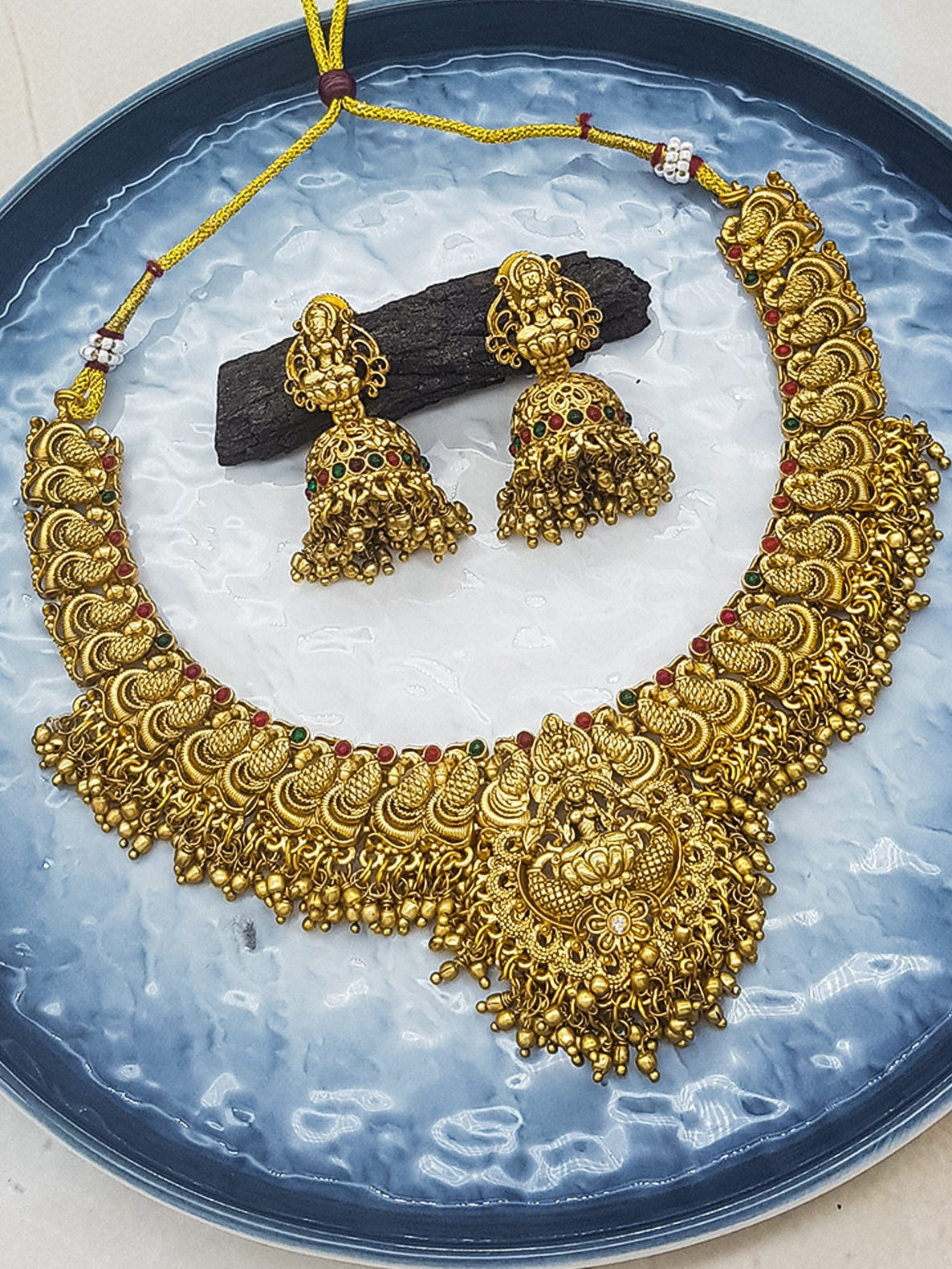 Exquisite and eye-catching, this premium brass-based necklace set features a peacock design with a Lakshmi set. The necklace is a perfect way to make a stunning style statement.