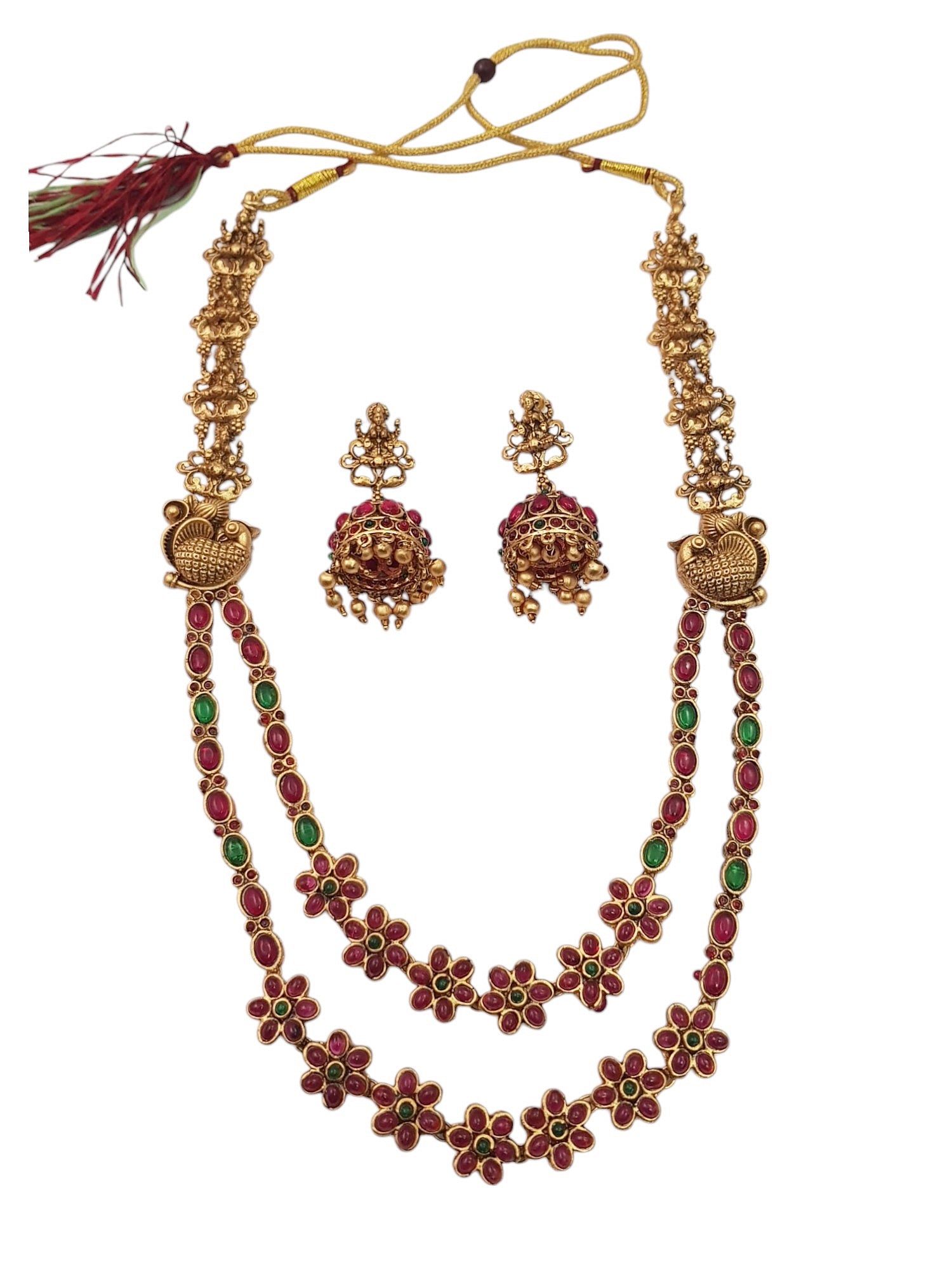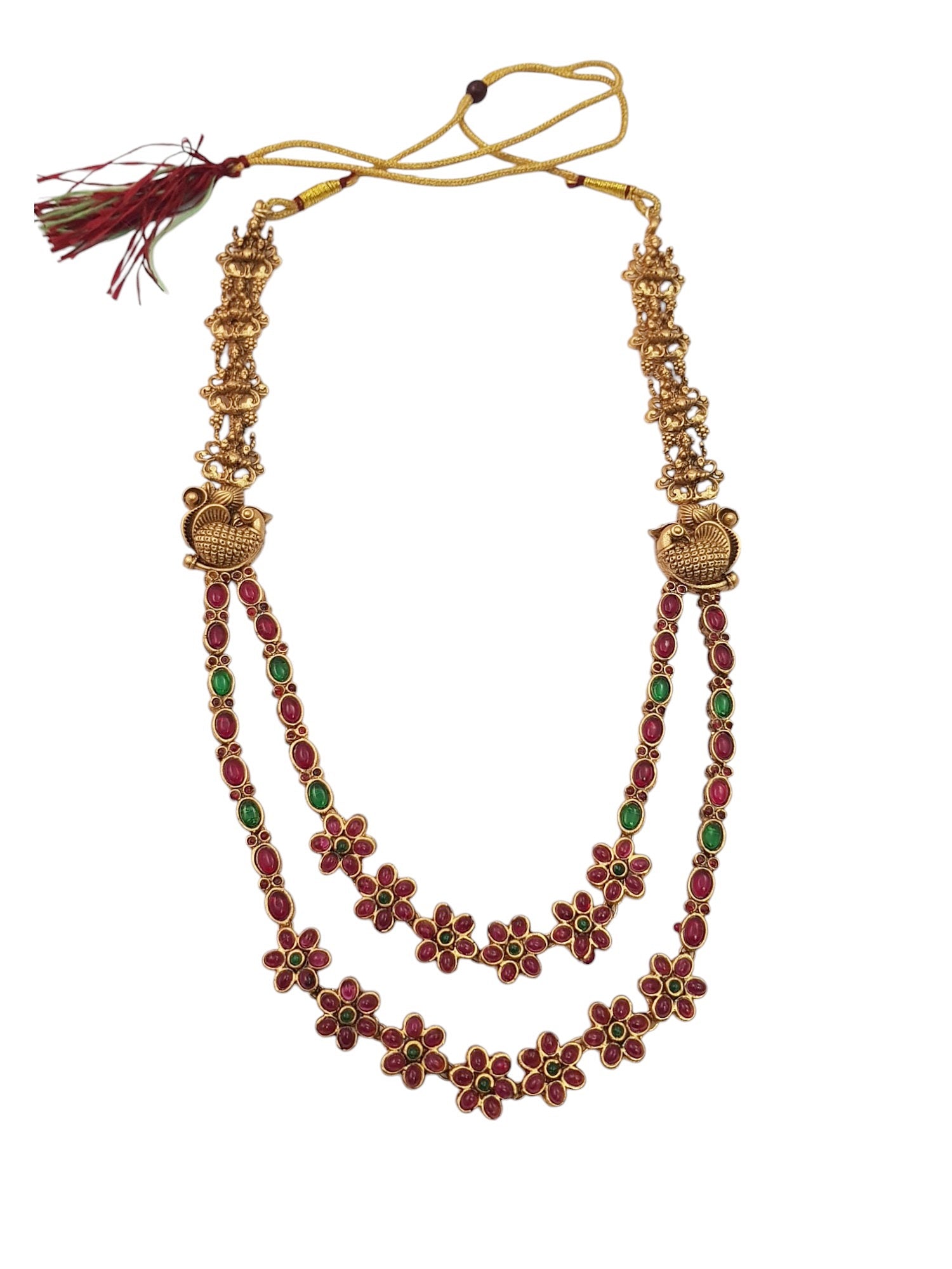 This gold plated Two Line Peacock Lakshmi Hara is the perfect addition to any jewelry collection. Featuring exquisite craftsmanship and intricate design, this hara will make the perfect gift for anyone who appreciates quality jewelry.