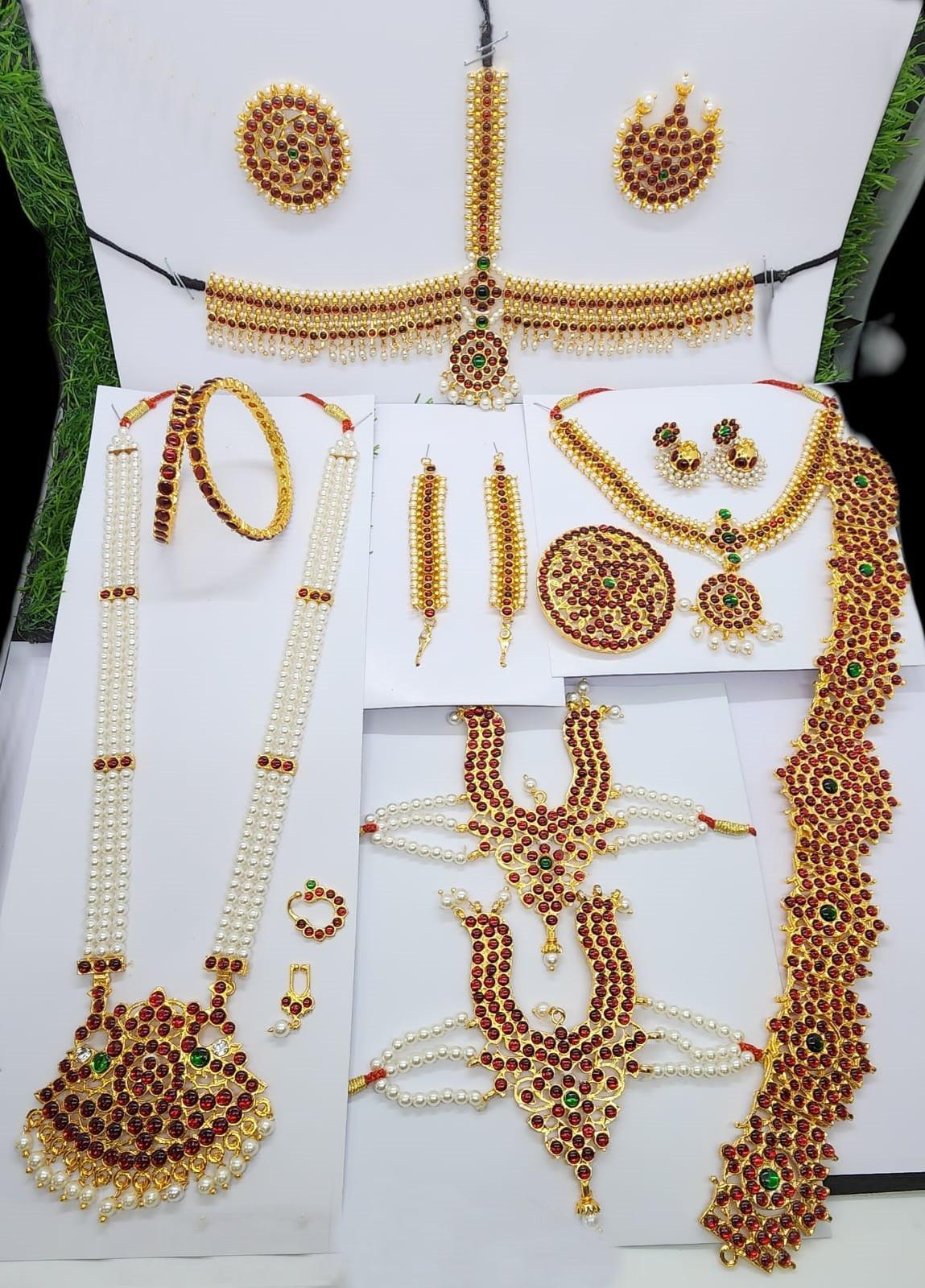 INCLUDES: 1 Long Necklace+1 short necklace + 1 Pair Earring+ 1 pair armband+ chanda + sooraj+ vadanam + 2 bangle