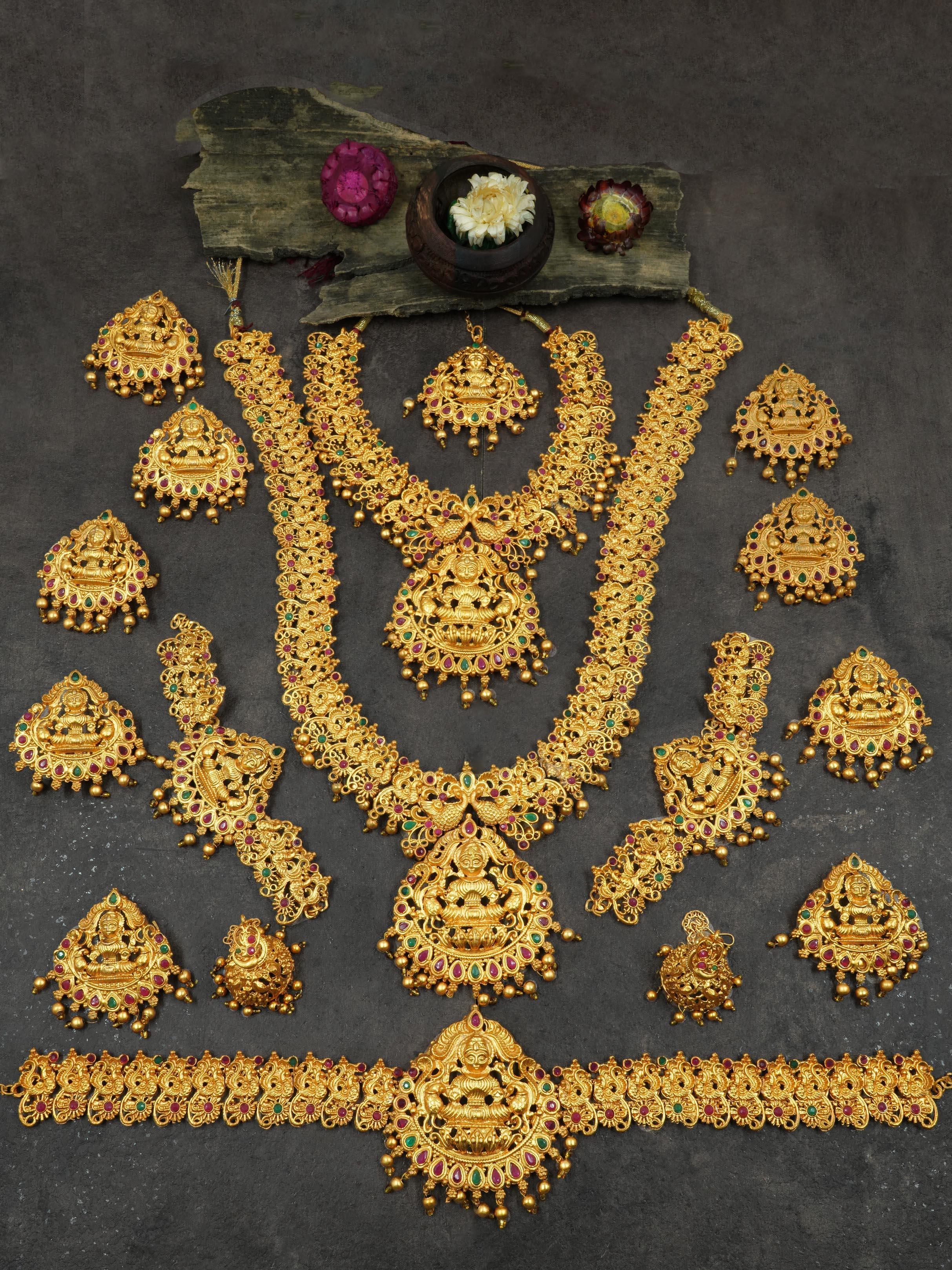 Inclusion : 1 Long Hara+ 1 Short Necklace + 1 pair of earrings + 1 mang tikka+2 vanki+1 waistbelt+ 9 hair clips