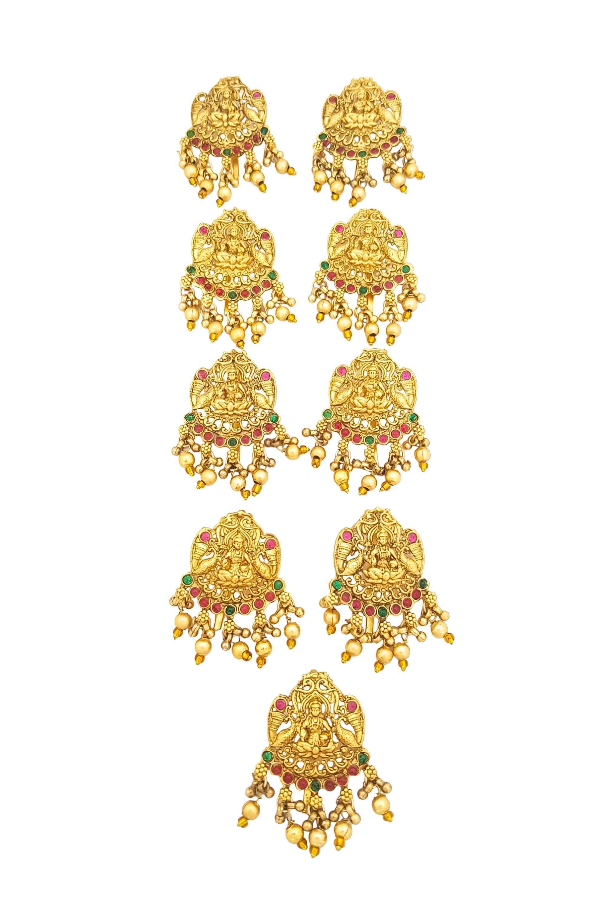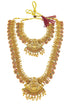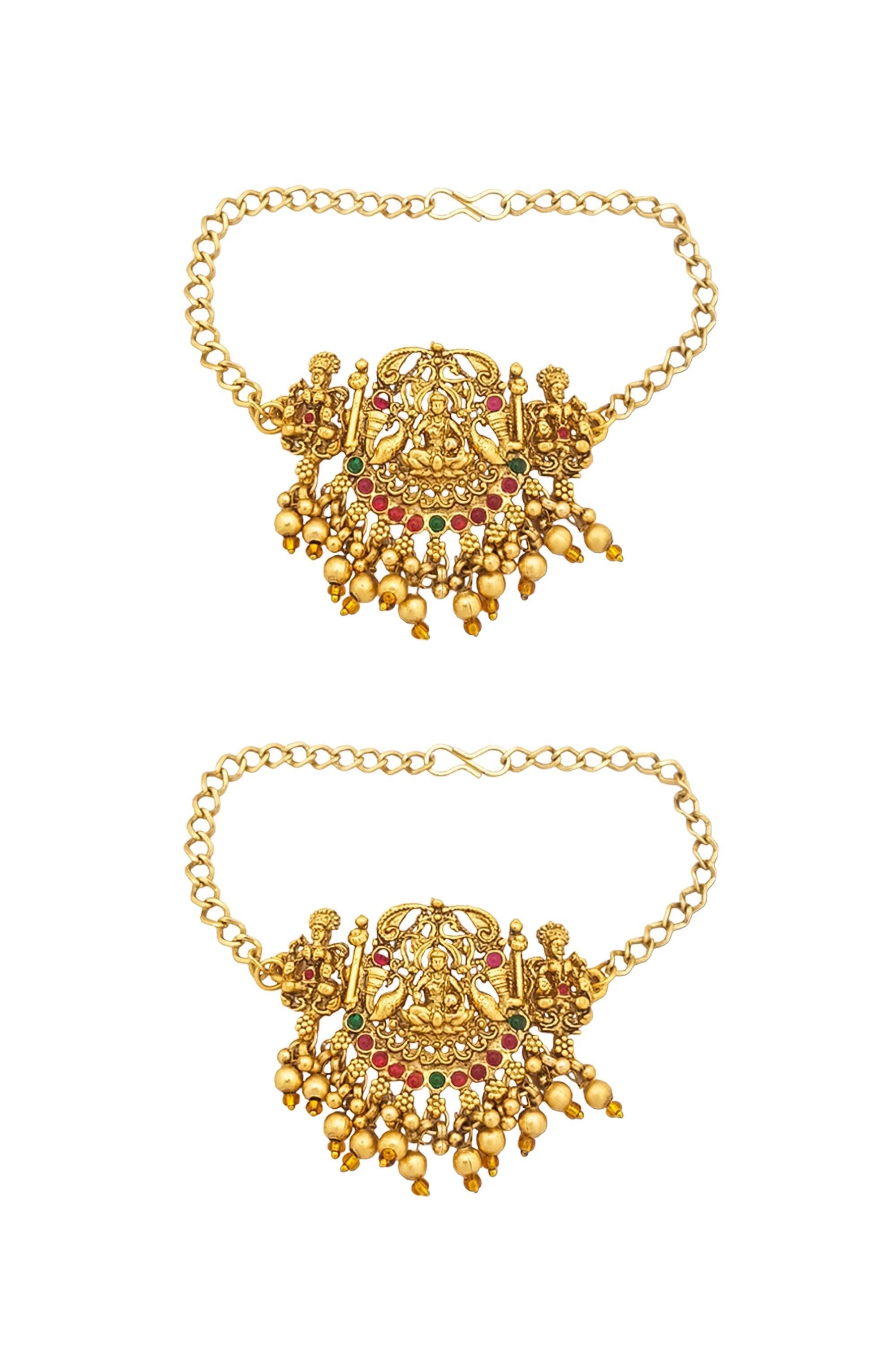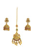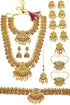 Treat yourself to this treasured Premium Gold Finish Full Bridal Set Combo 15907N. Perfect for all your special occasions, this set includes a bridal necklace, two tikka hair pins, and an anklet - all at an attractive price! Look elegant and regal with this must-have combo that is sure to take your style up a notch.