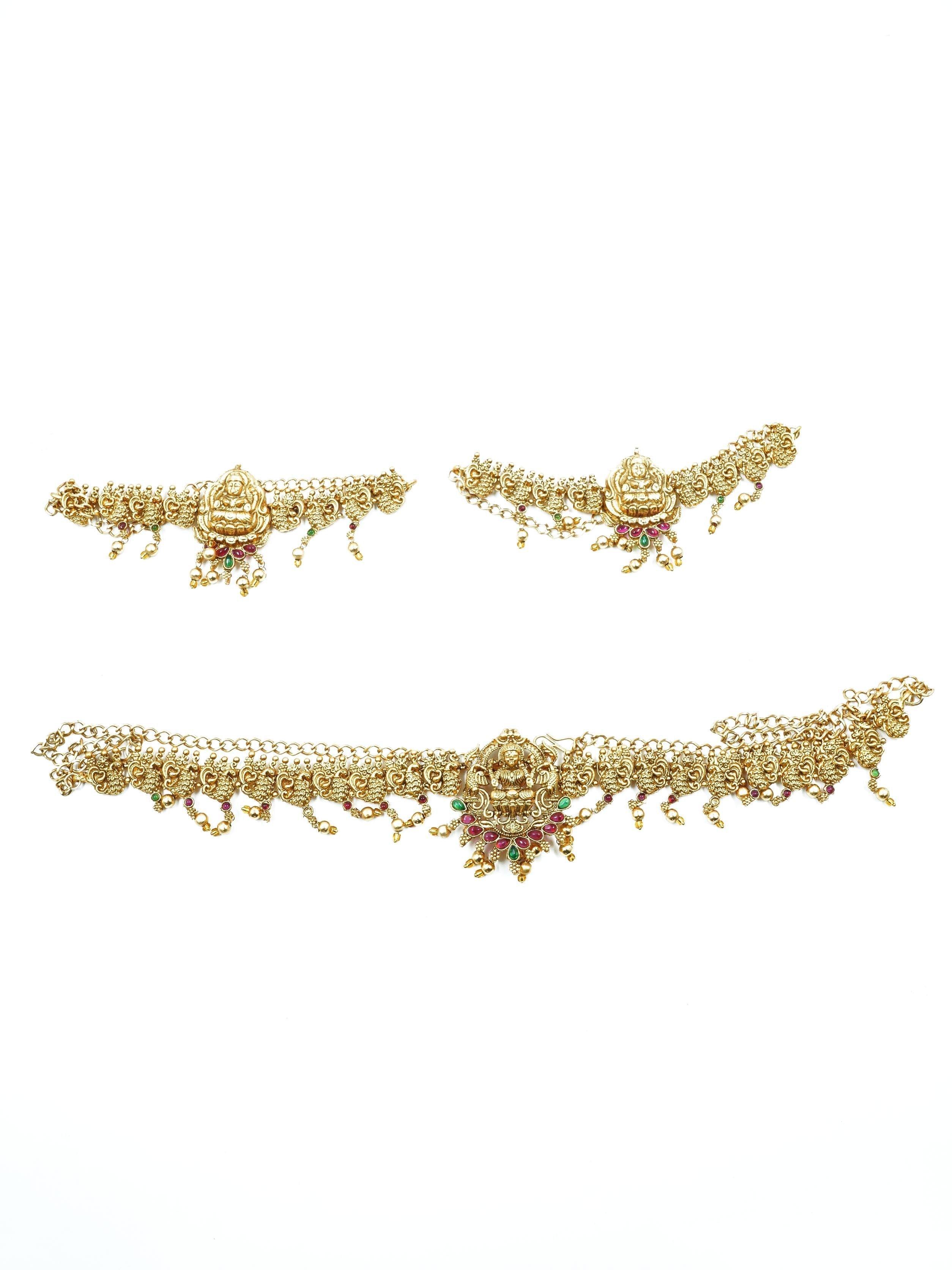 Inclusion : 1 Long Hara+ 1 Short Necklace + 1 pair of earrings + 1 mang tikka+2 vanki+1 waistbelt+ 9 hair clips
