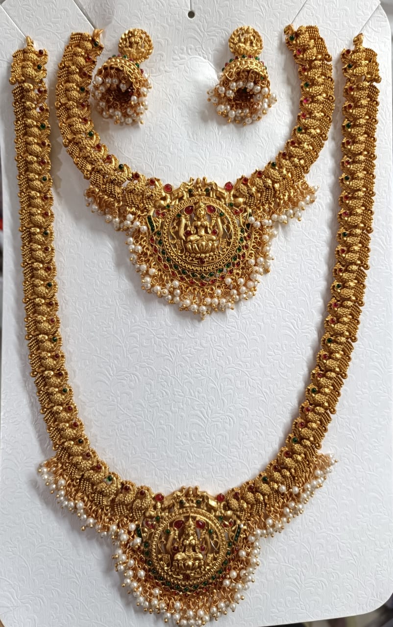 Add a touch of antique elegance to your bridal look with our Premium Gold finish Laxmi necklace combo set. Featuring a traditional Laxmi necklace, this combo set is the perfect addition to any bride's ensemble. Bring good luck and prosperity with this stunning piece.