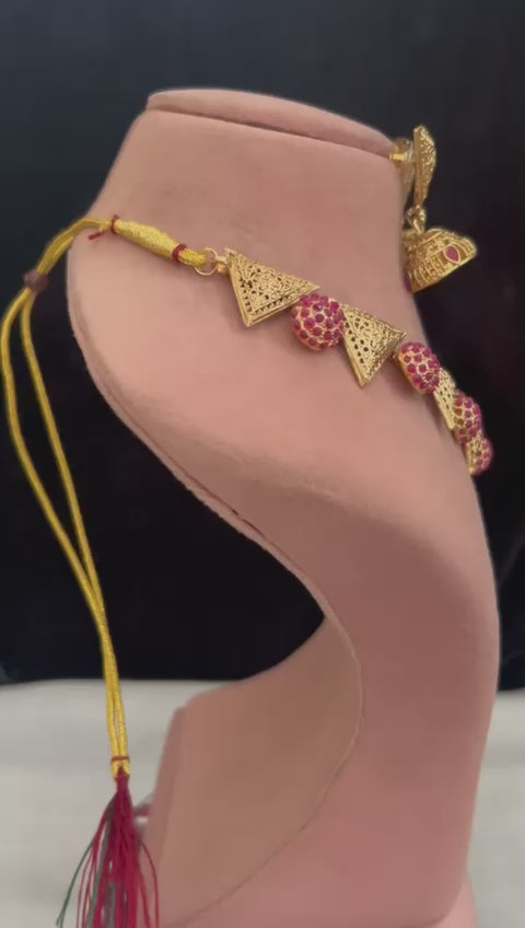 Premium Gold Finish Trending Triangle design Short All occasions Necklace Set with red stone