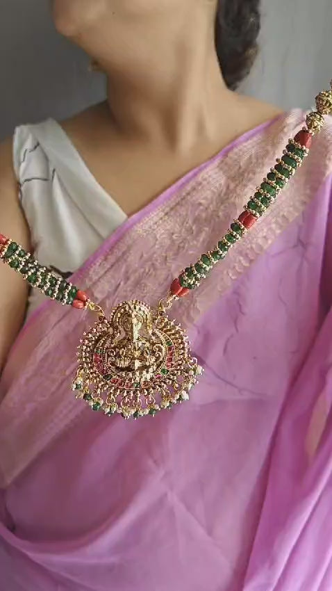 Premium Gold Plated Long Necklace Set in green Red coral & crystal natural stones