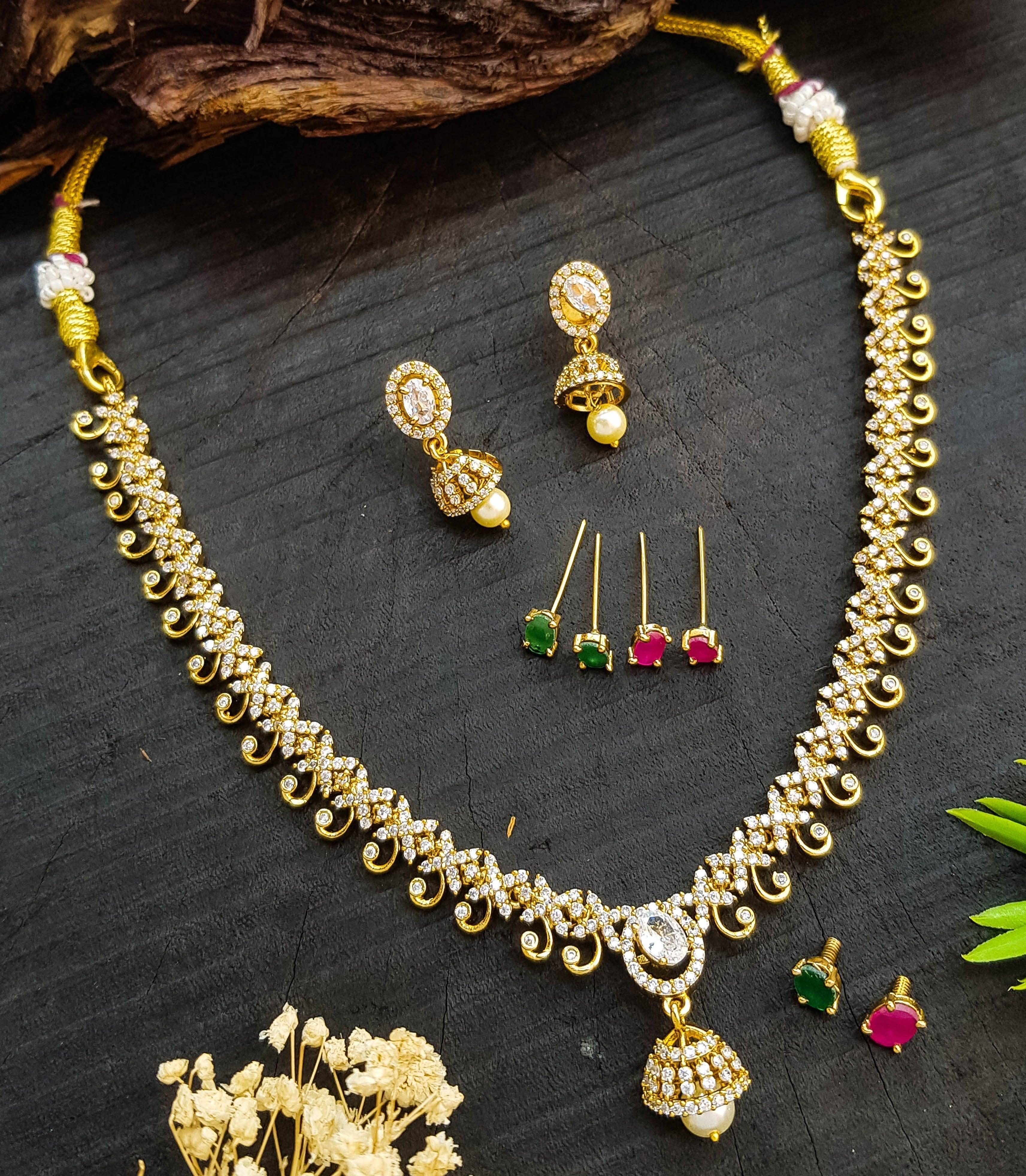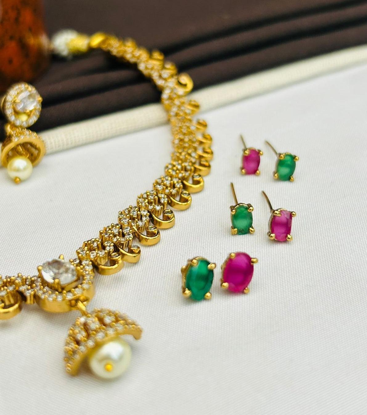 Inclusion : 1 Necklace & 1 pair of earrings , Interchangeable Stone (Red, White and Green)