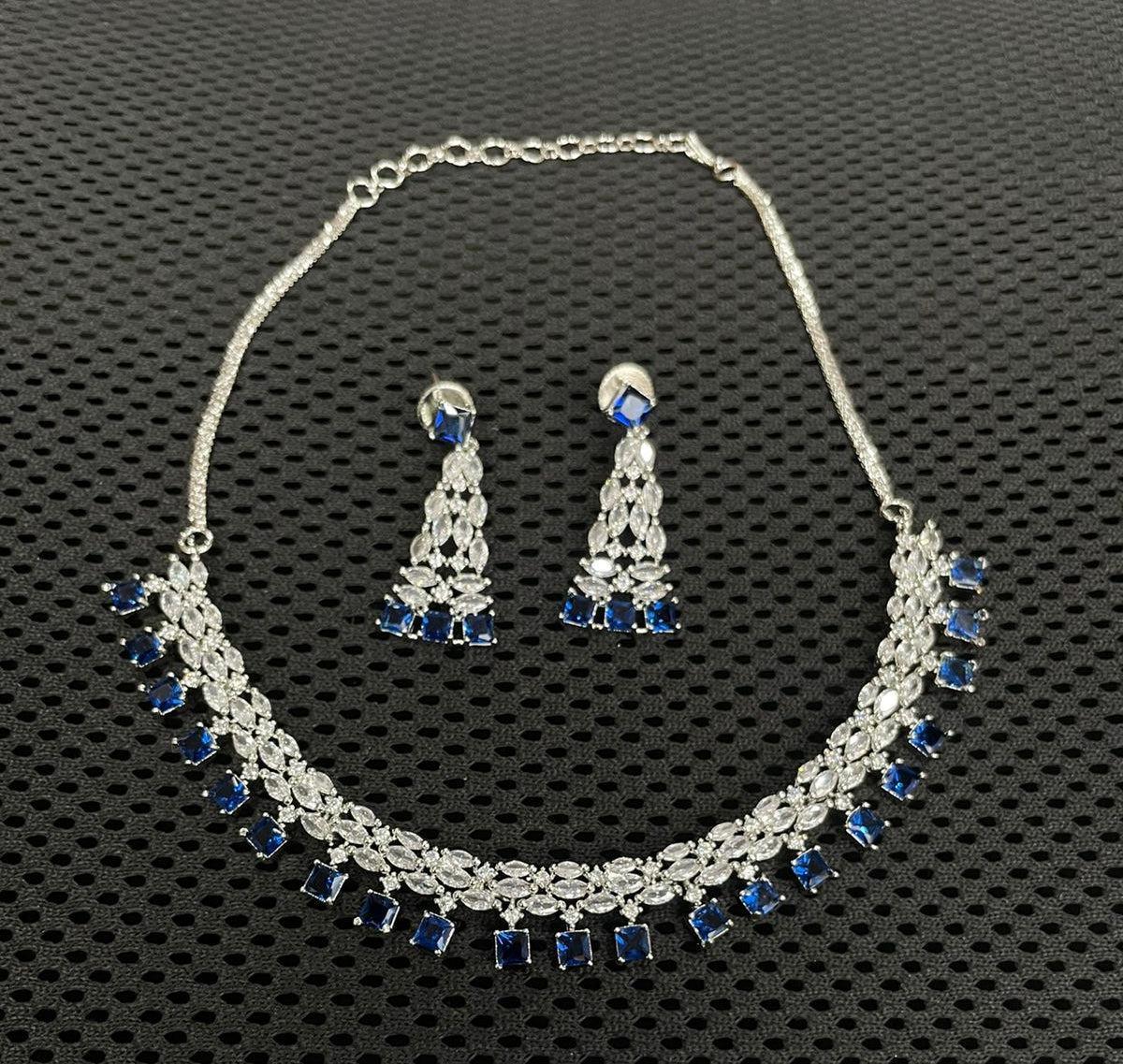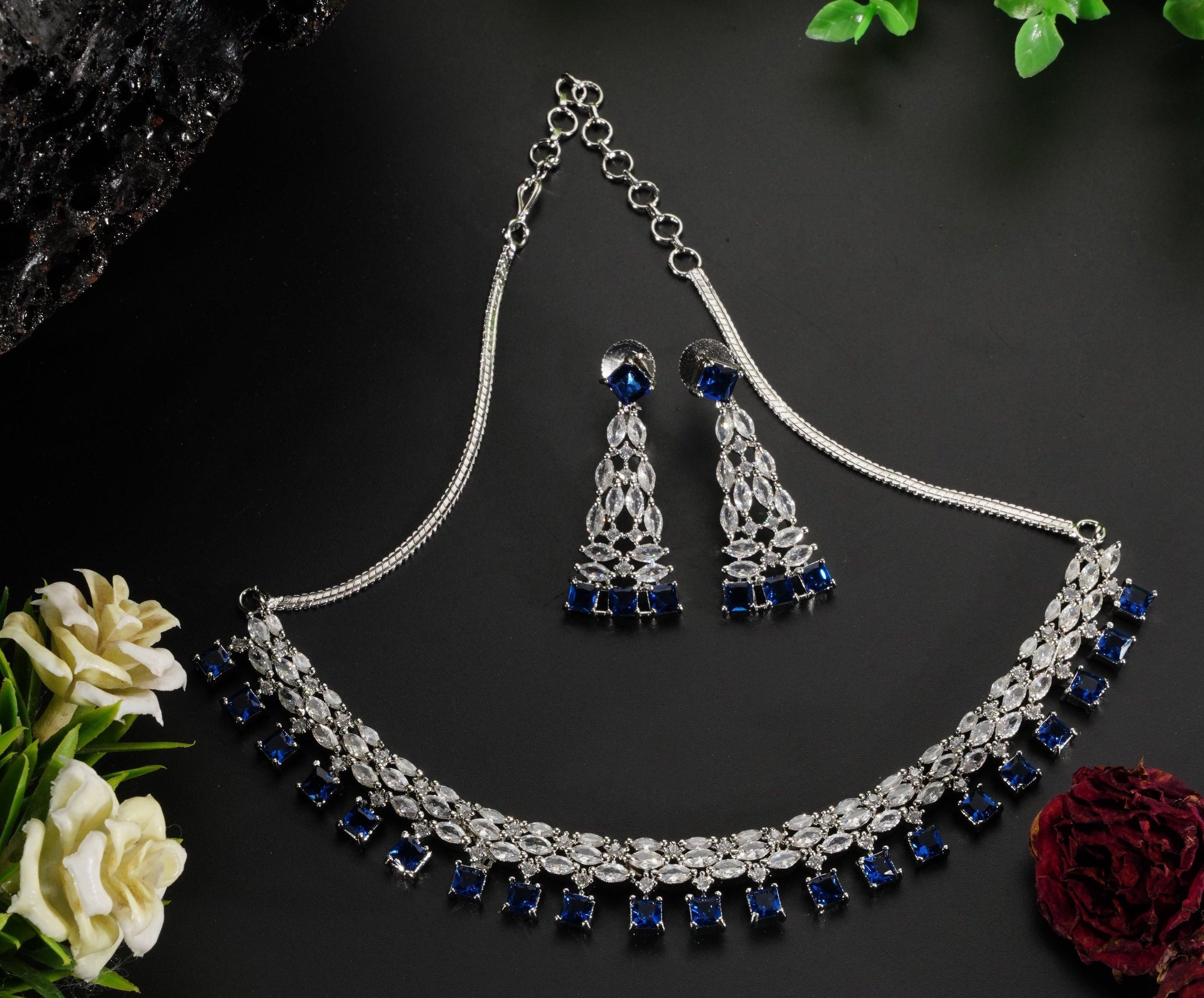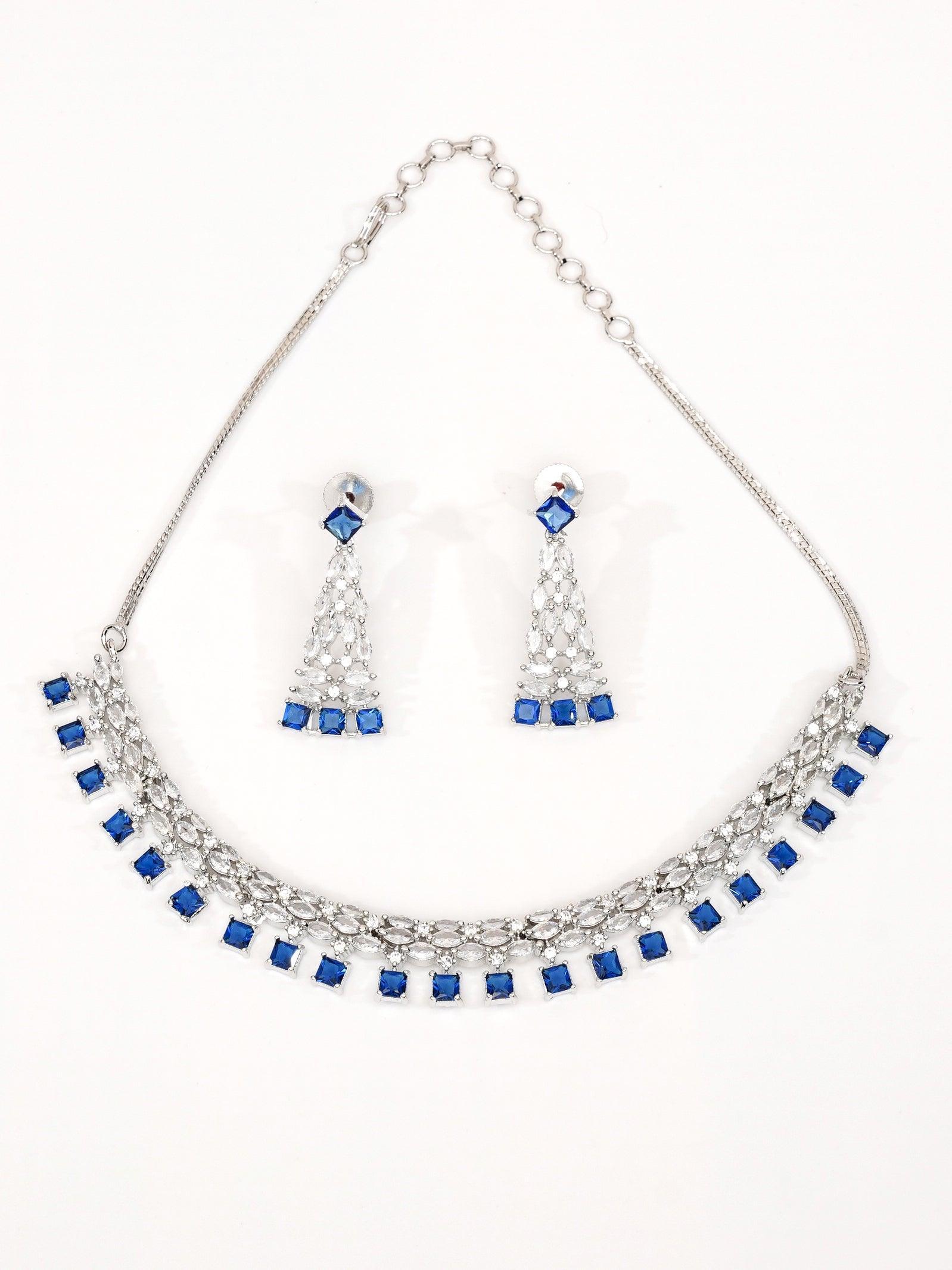Premium Sayara Collection White Gold Plated Necklace set with best quality blue CZ Ston